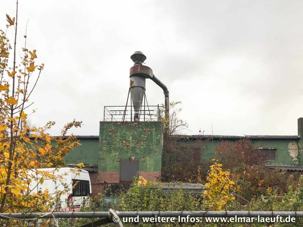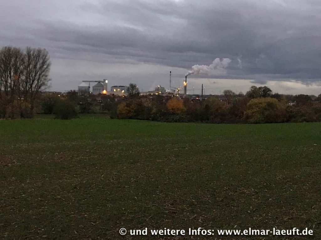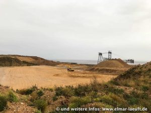 Ein Batterie von Schildern mit Warnzeichen und der Aufschrift “Betriebsgelände – Zutritt verboten” hält mich von einem Besuch der Grube ab. Gerade in diesen Tagen muss ich wohl hier nicht unbedingt auffällig werden. In einer Lücke ohne Schilder erhalte ich am Ende dennoch einen Blick, indem ich auf einen kleinen Erdhügel klettere. Leider ist hier nur eine Art Kiesbaggerei, der große Blick auf die Grube bleibt mir weiterhin verwehrt.