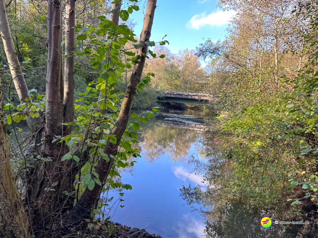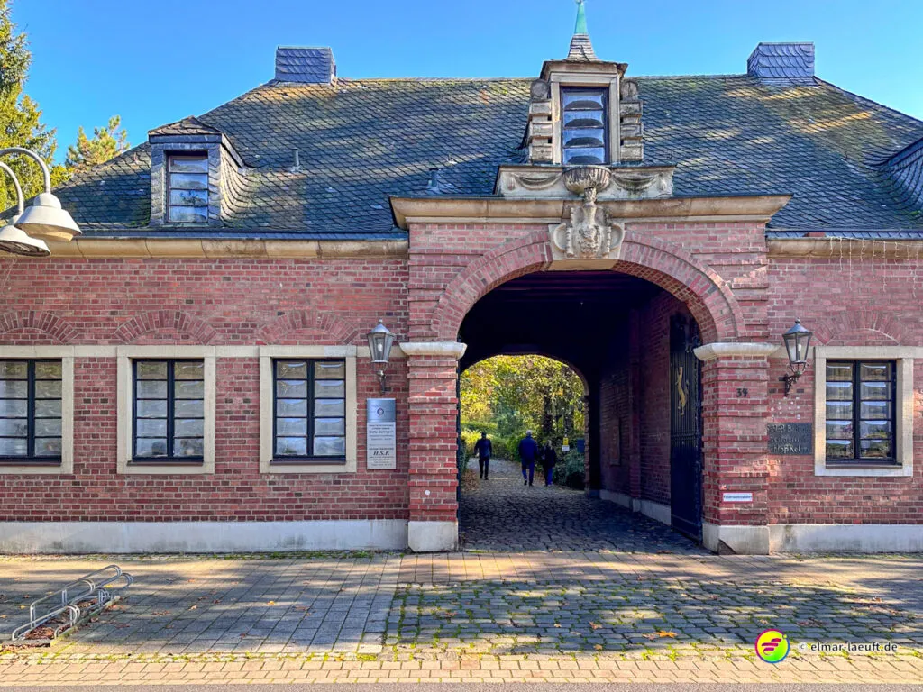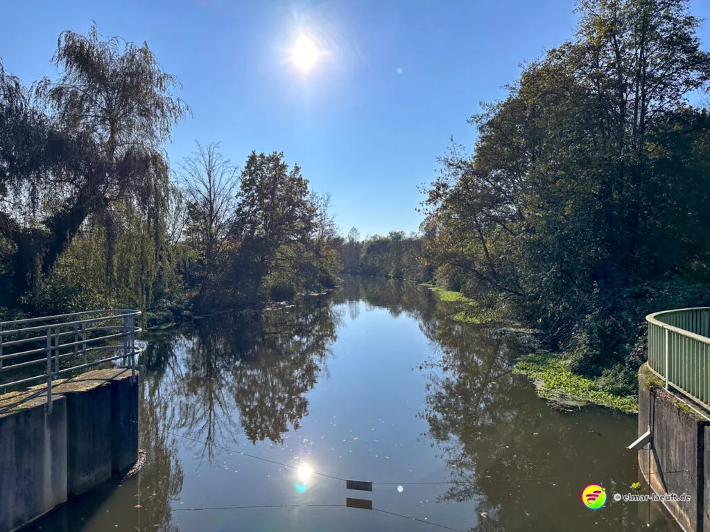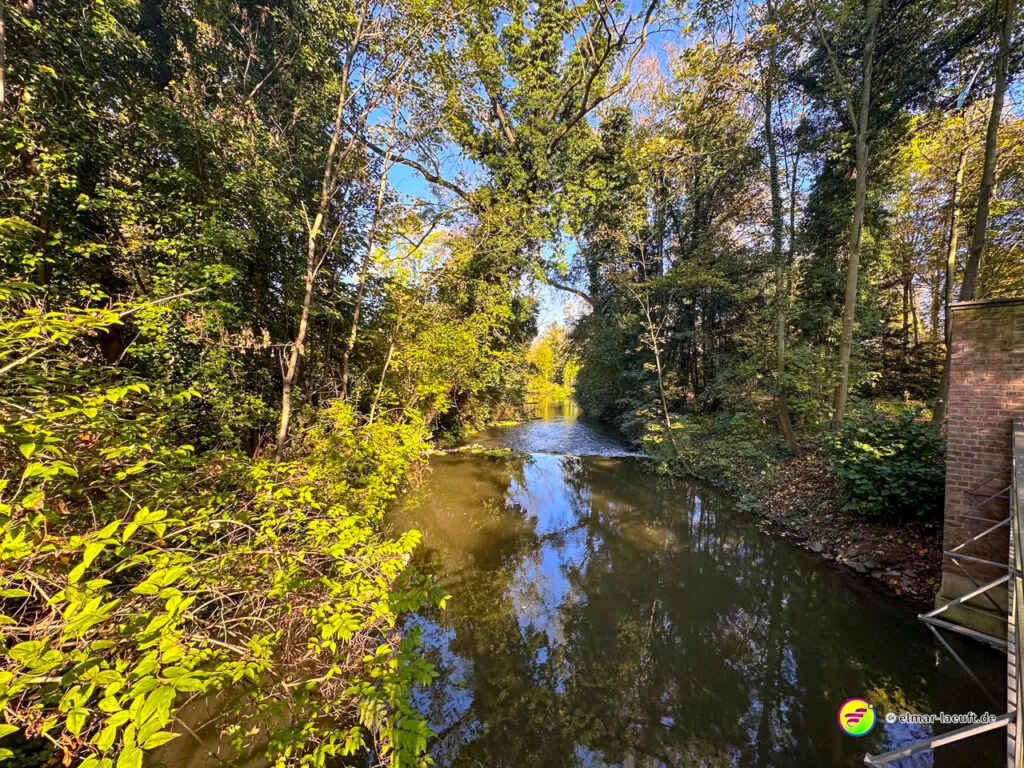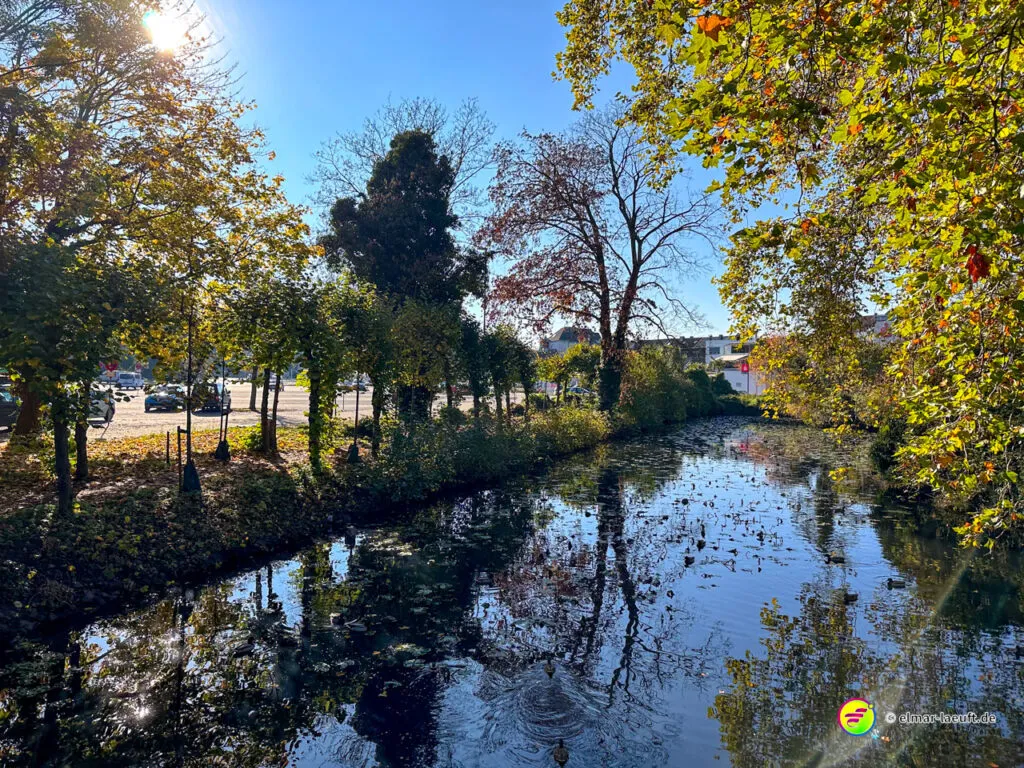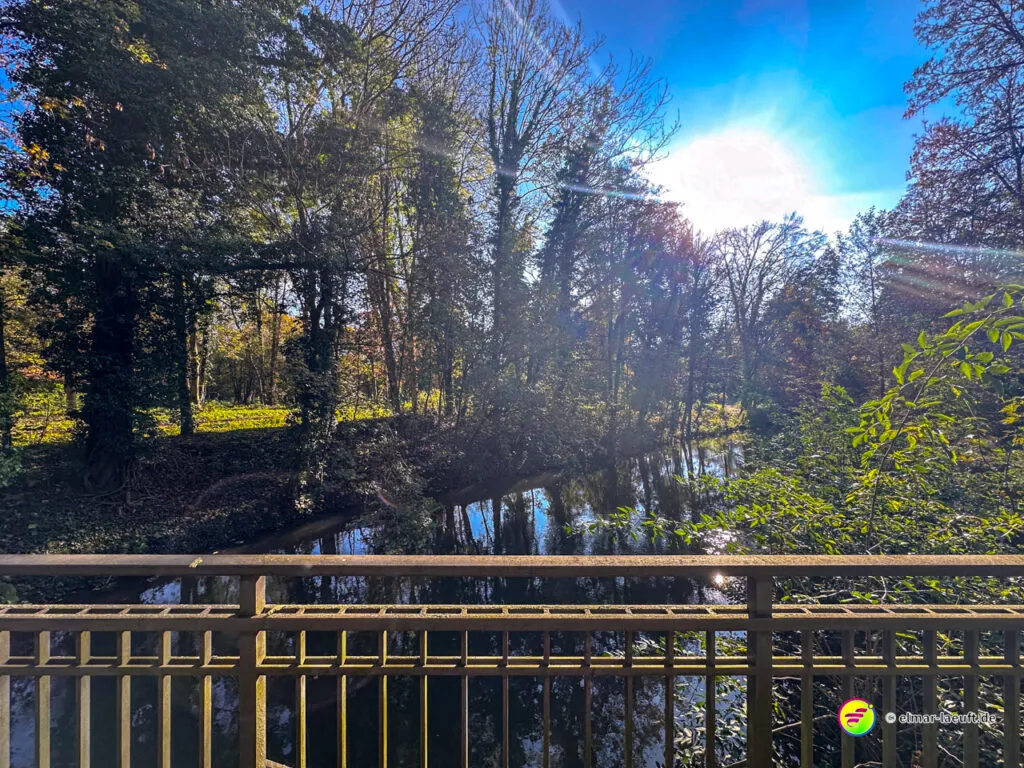 Bei überraschend warmen Wetter – zumindest so lange man sich im Blickfeld der Sonne bewegt – verlasse ich zunächst Alt-Kaster in Richtung der Erft. Genauer gesagt: der Kasterer Mühlenerft. Am Waldrand und der Erft entlang geht es über ein ruhiges Wohngebiet nach Bedburg hinein. Ein Schild am Laternenmast weist mich auf den Werwolf-Wanderweg hin. Über den Marktplatz geht es einmal beim Schloss Bedburg vorne durch das Portal hinein und hinten am Schlossweiher vorbei und durch den Schlosspark bis durch das Portal wieder hinaus.