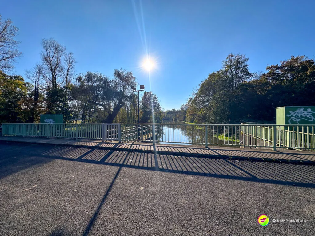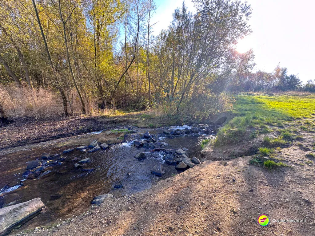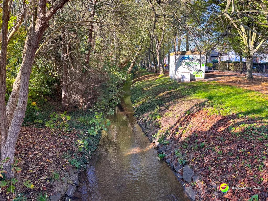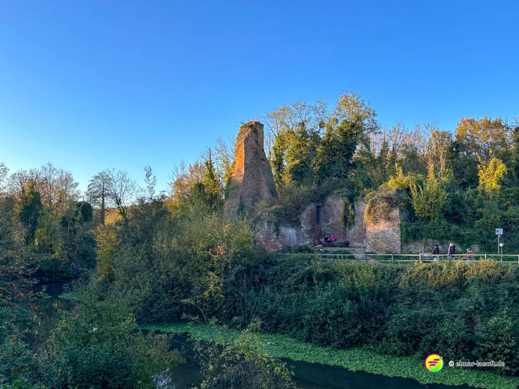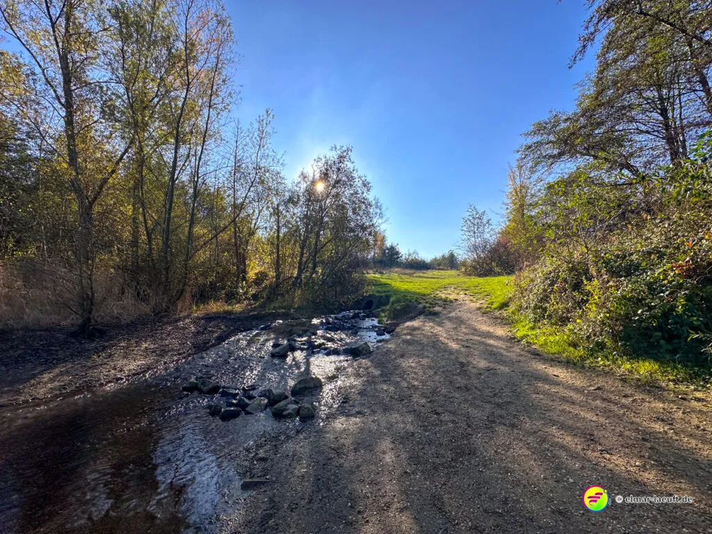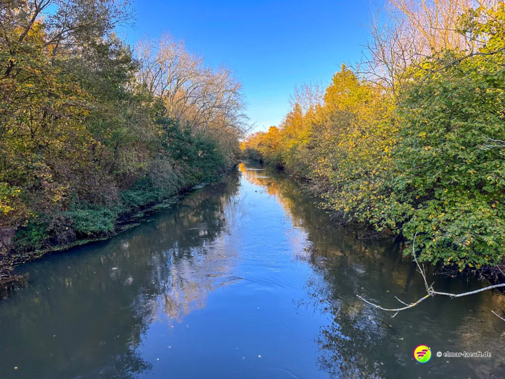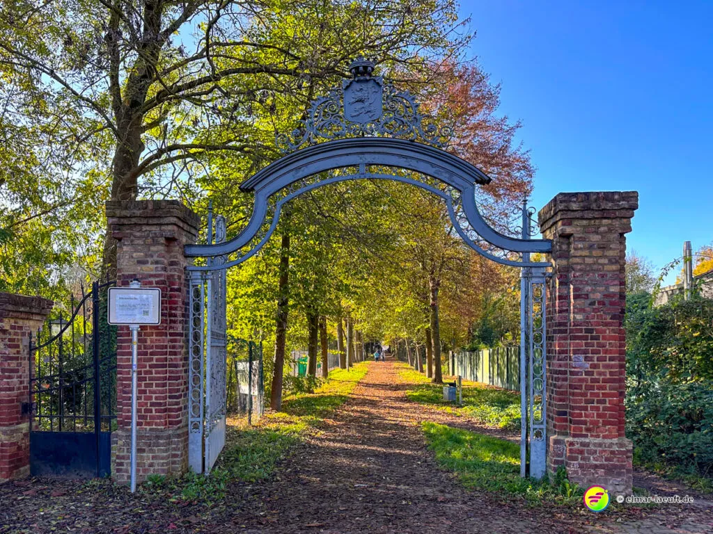Bei überraschend warmen Wetter – zumindest so lange man sich im Blickfeld der Sonne bewegt – verlasse ich zunächst Alt-Kaster in Richtung der Erft. Genauer gesagt: der Kasterer Mühlenerft. Am Waldrand und der Erft entlang geht es über ein ruhiges Wohngebiet nach Bedburg hinein. Ein Schild am Laternenmast weist mich auf den Werwolf-Wanderweg hin. Über den Marktplatz geht es einmal beim Schloss Bedburg vorne durch das Portal hinein und hinten am Schlossweiher vorbei und durch den Schlosspark bis durch das Portal wieder hinaus.