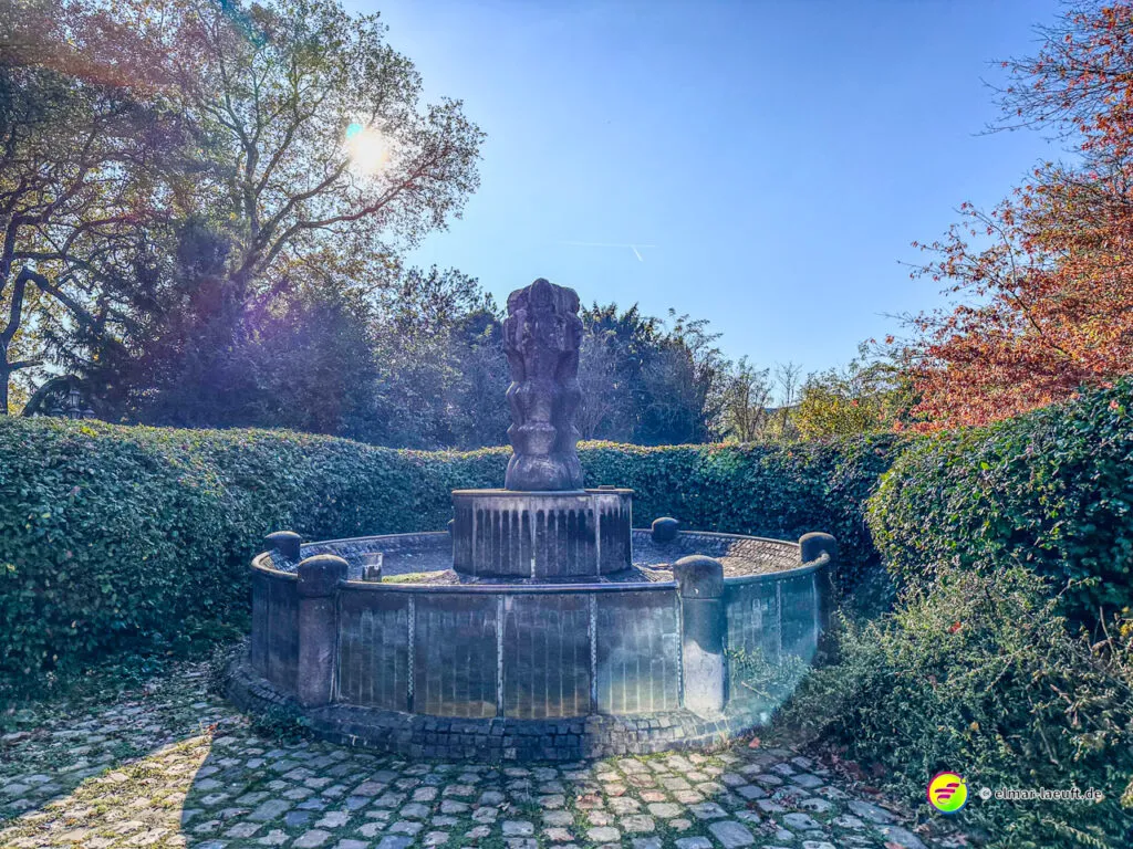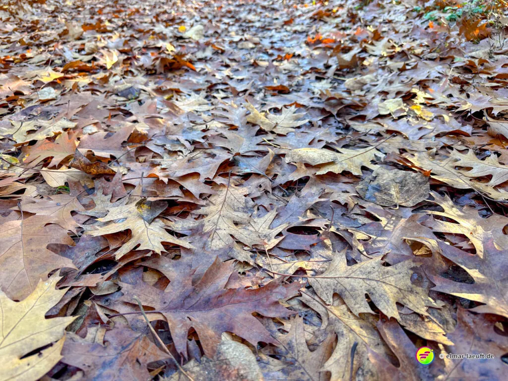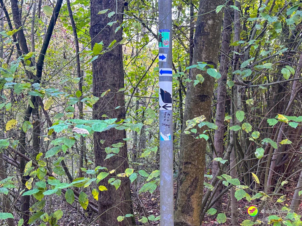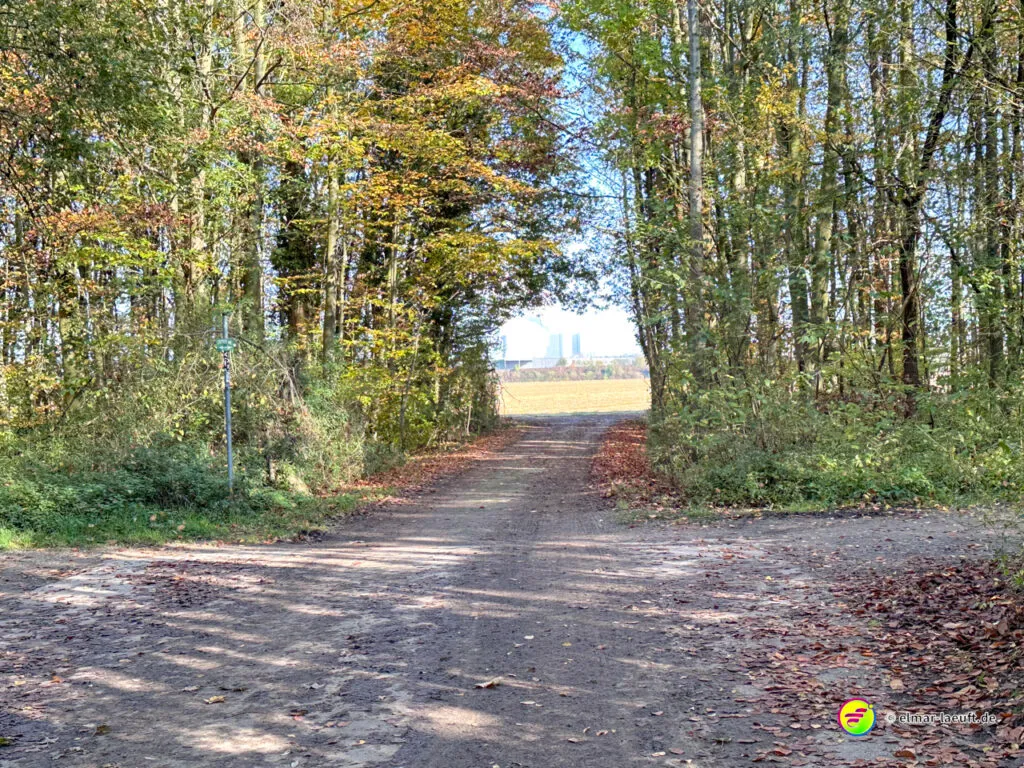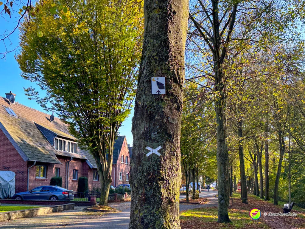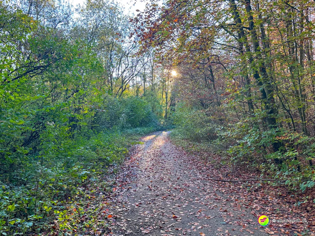 Bei überraschend warmen Wetter – zumindest so lange man sich im Blickfeld der Sonne bewegt – verlasse ich zunächst Alt-Kaster in Richtung der Erft. Genauer gesagt: der Kasterer Mühlenerft. Am Waldrand und der Erft entlang geht es über ein ruhiges Wohngebiet nach Bedburg hinein. Ein Schild am Laternenmast weist mich auf den Werwolf-Wanderweg hin. Über den Marktplatz geht es einmal beim Schloss Bedburg vorne durch das Portal hinein und hinten am Schlossweiher vorbei und durch den Schlosspark bis durch das Portal wieder hinaus.