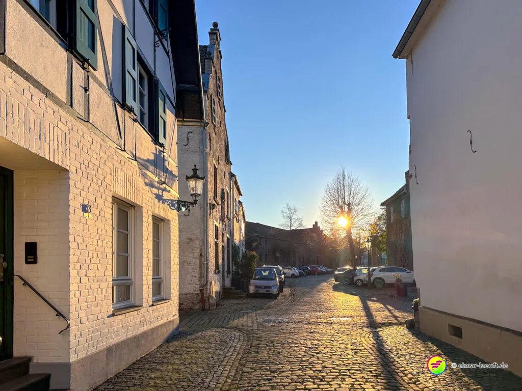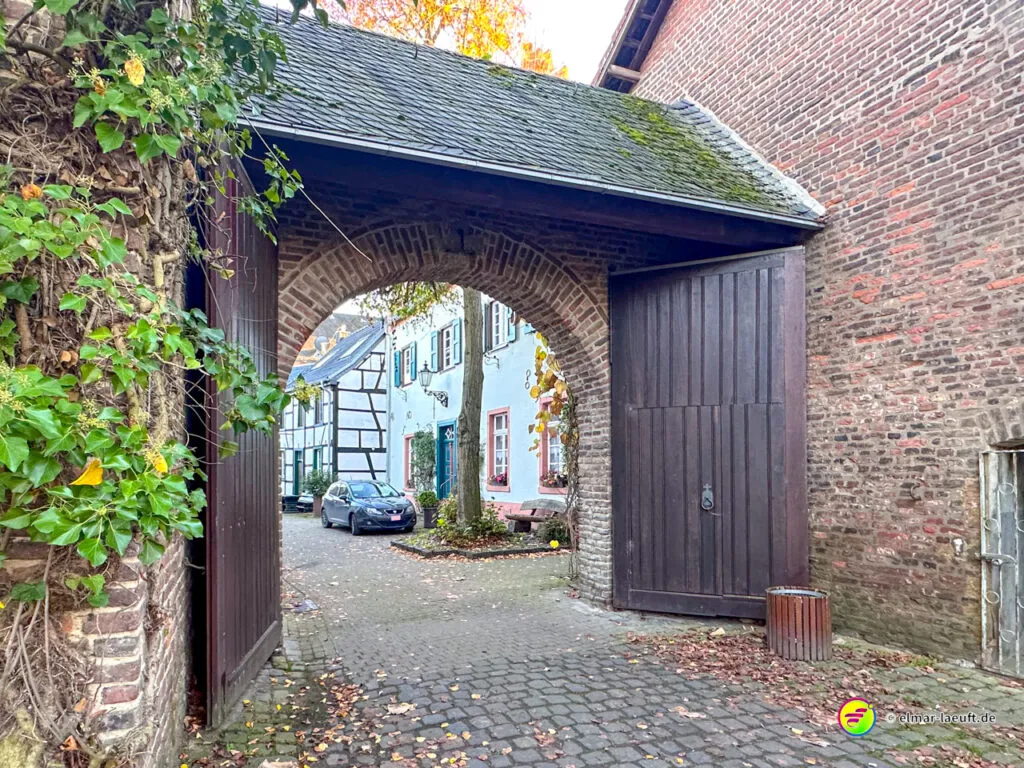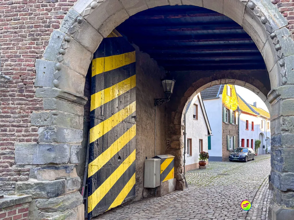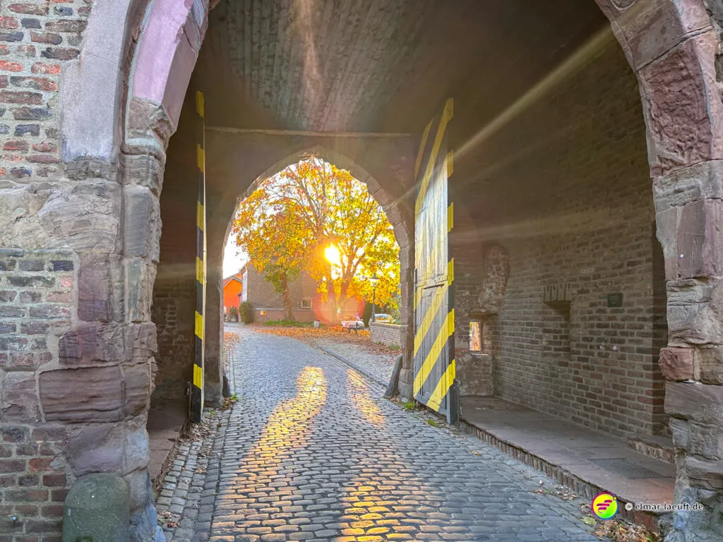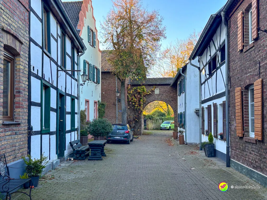 Zum Abschluss darf ich noch den herrlichen Charme des historischen Alt-Kaster erleben. Durch ein großes Stadttor laufe ich auf die pflastersteinbewehrte Straße ein. Durch kleine Gassen entdecke ich viele schöne Details an den Häusern und verlasse den Kern durch ein weiteres Tor wieder in die Außenwelt.