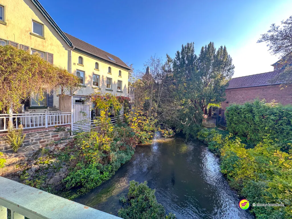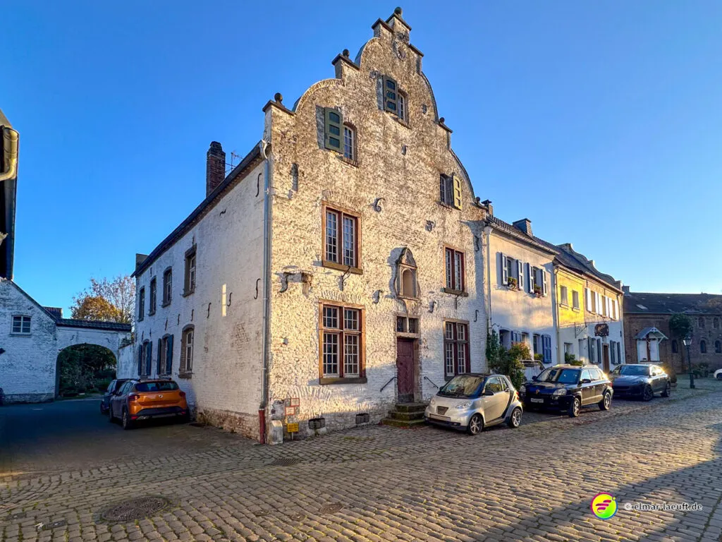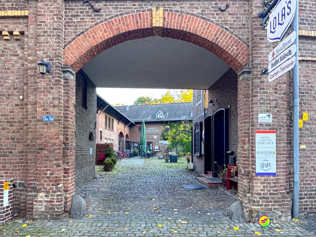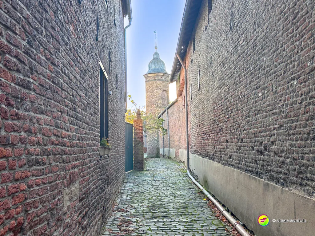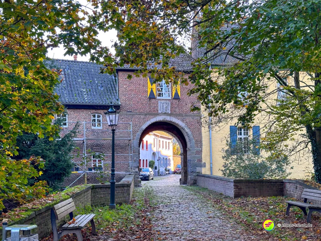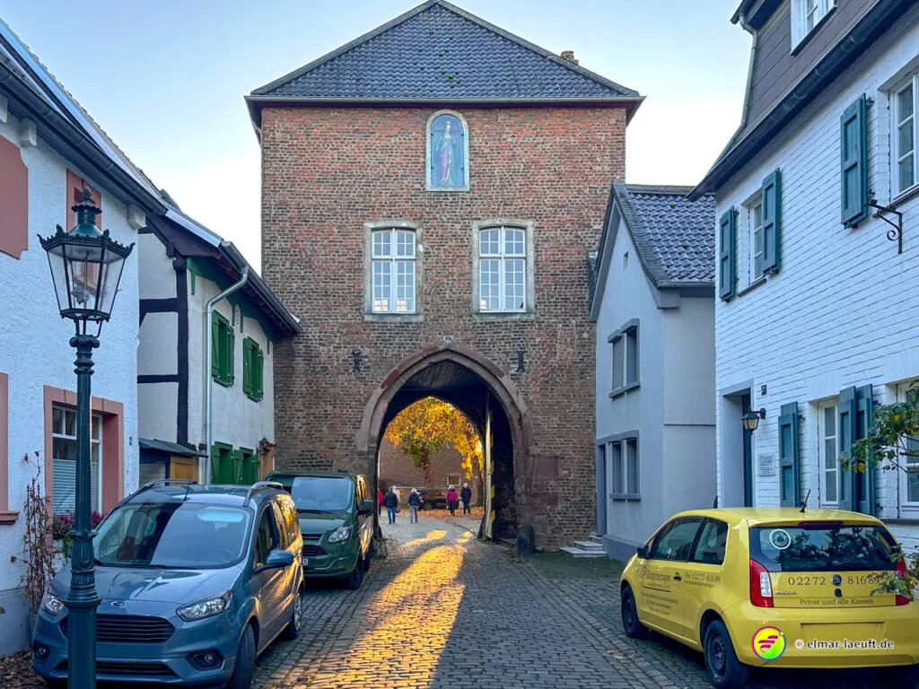 Zum Abschluss darf ich noch den herrlichen Charme des historischen Alt-Kaster erleben. Durch ein großes Stadttor laufe ich auf die pflastersteinbewehrte Straße ein. Durch kleine Gassen entdecke ich viele schöne Details an den Häusern und verlasse den Kern durch ein weiteres Tor wieder in die Außenwelt.