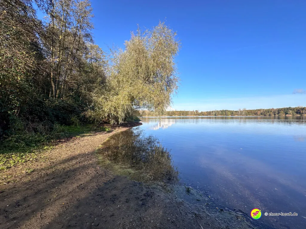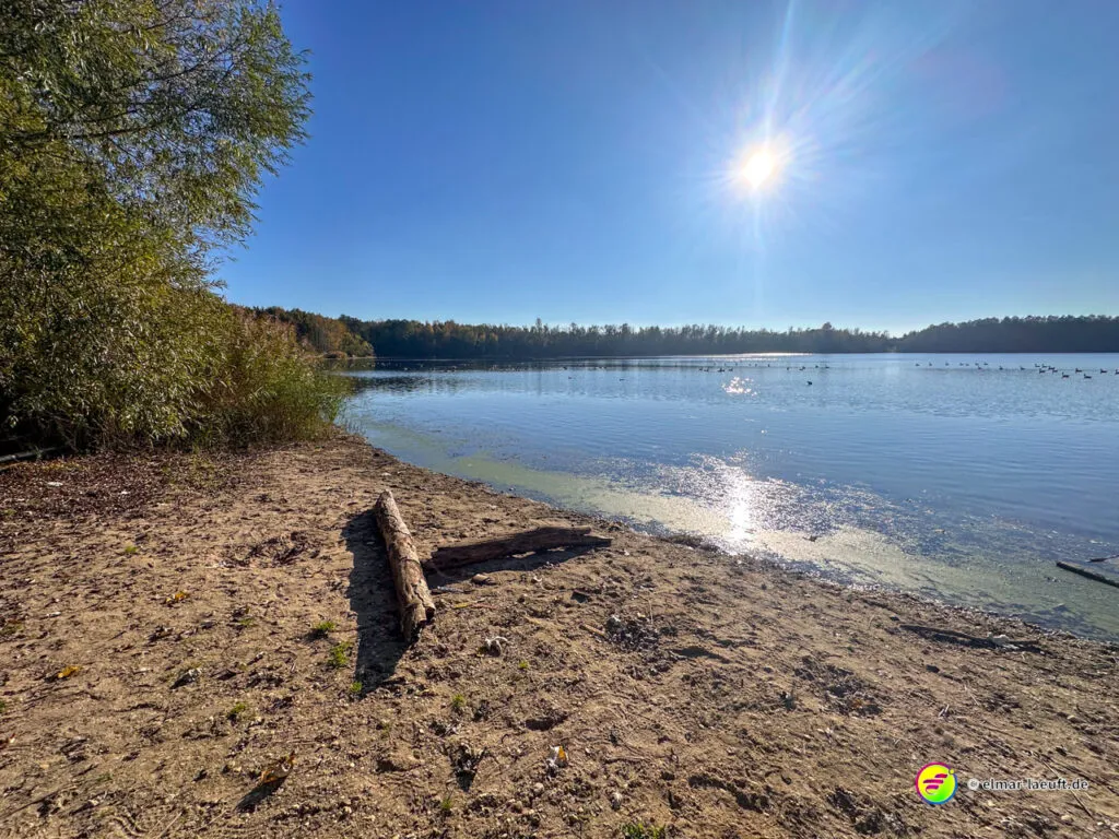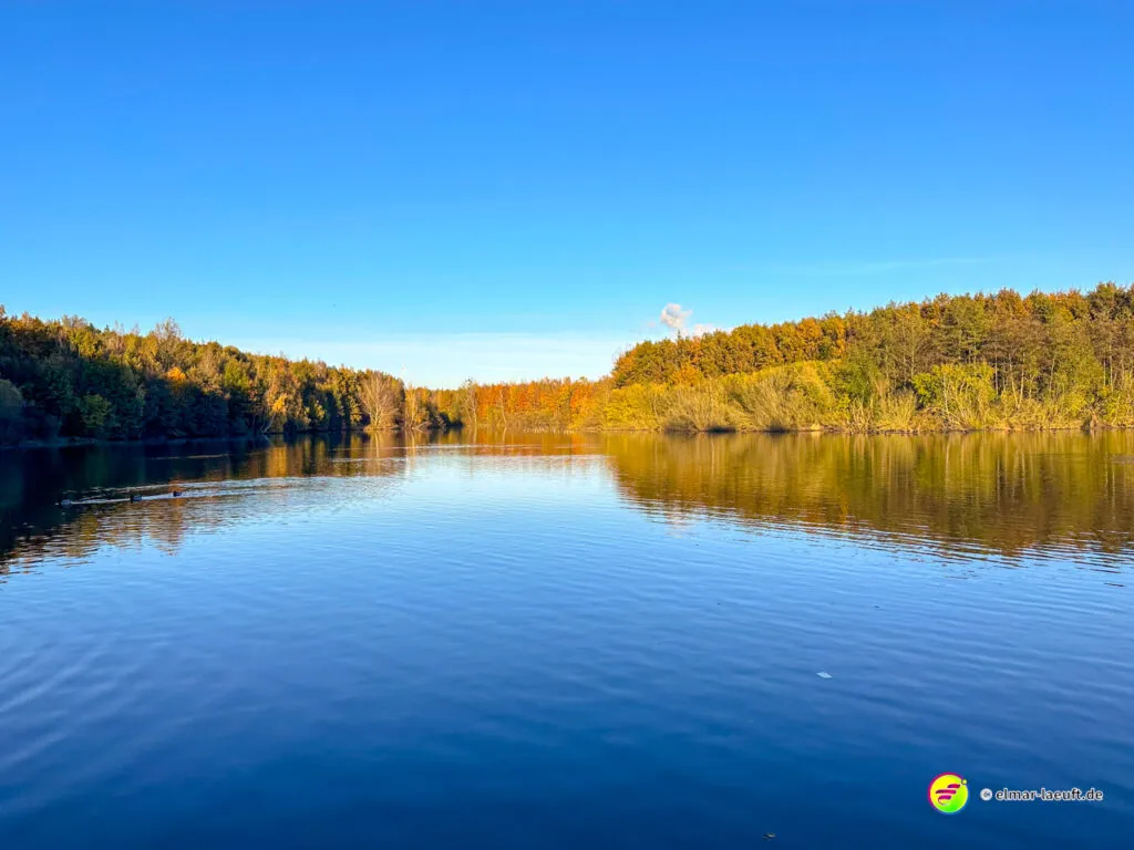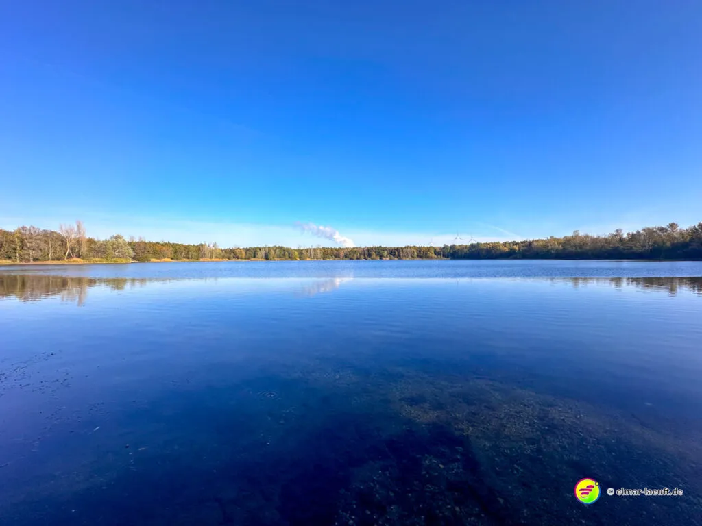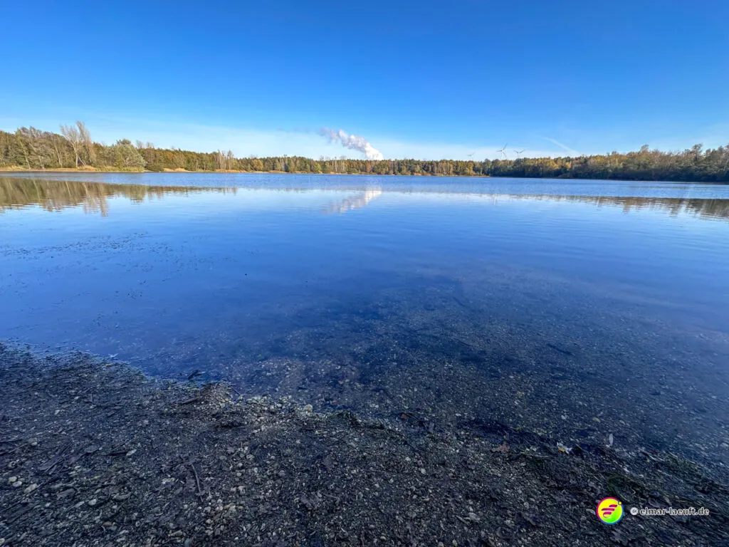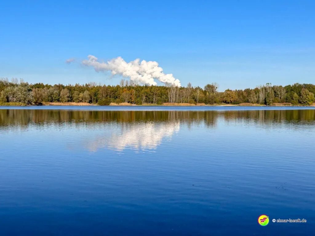 Am Horizont meines Blickfeldes pustet das Kraftwerk Niederaußem kleine, weiße Wölkchen in den ansonsten wolkenlosen, blauen Himmel und ich nähere mich dem Peringsmaar, einem künstlichen See in einem Tagebaurestloch. Nun stehe ich am See und sehe immer noch die kleinen Wölkchen, die noch mehrheitlichen grünen Bäume spiegeln sich auf dem stahlblauen Wasser des Sees. Ein unglaubliches Bild. Die kleinen, zugänglichen Mulden am See sind offenbar beliebte Plätze und so sind einige der eher kleinen Plätze mit Besuchern belegt.