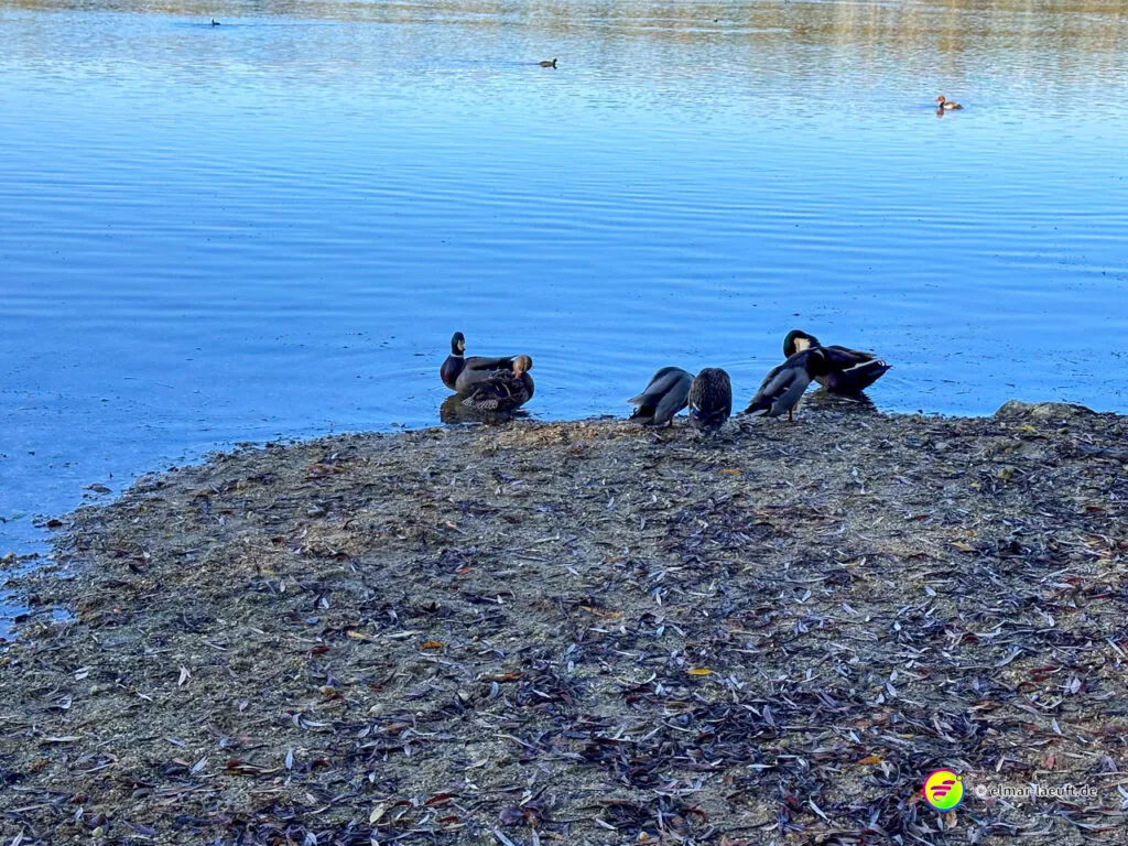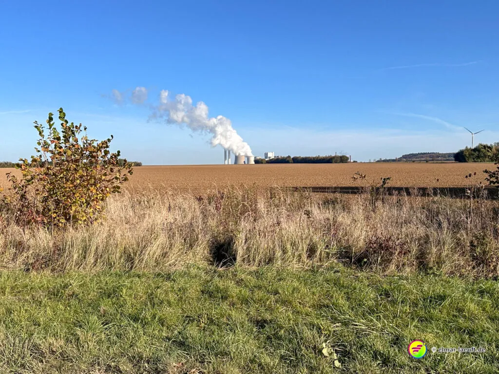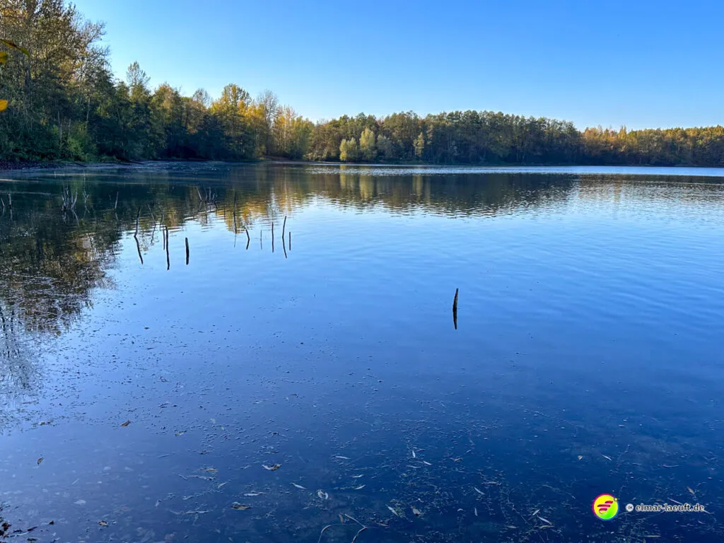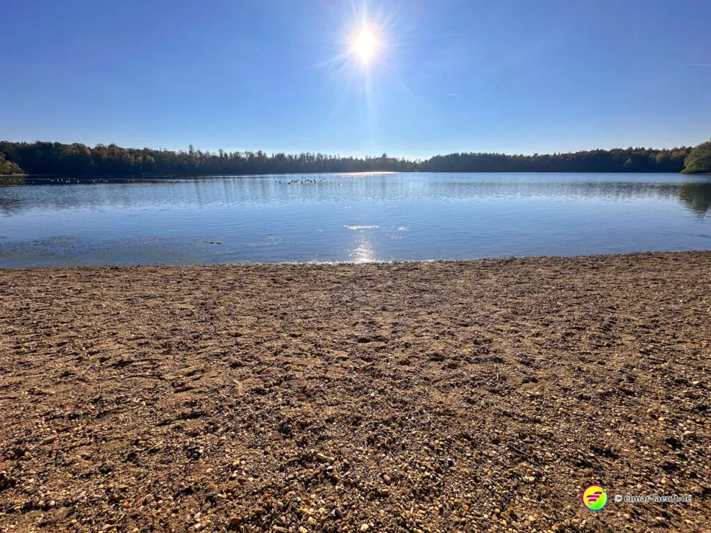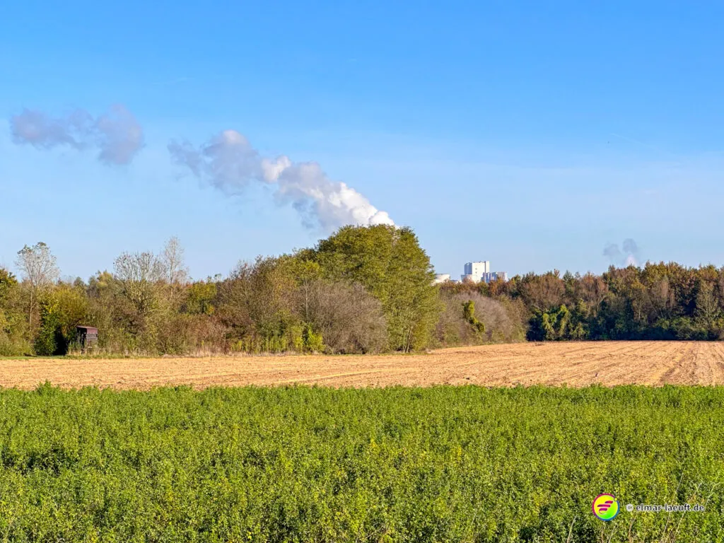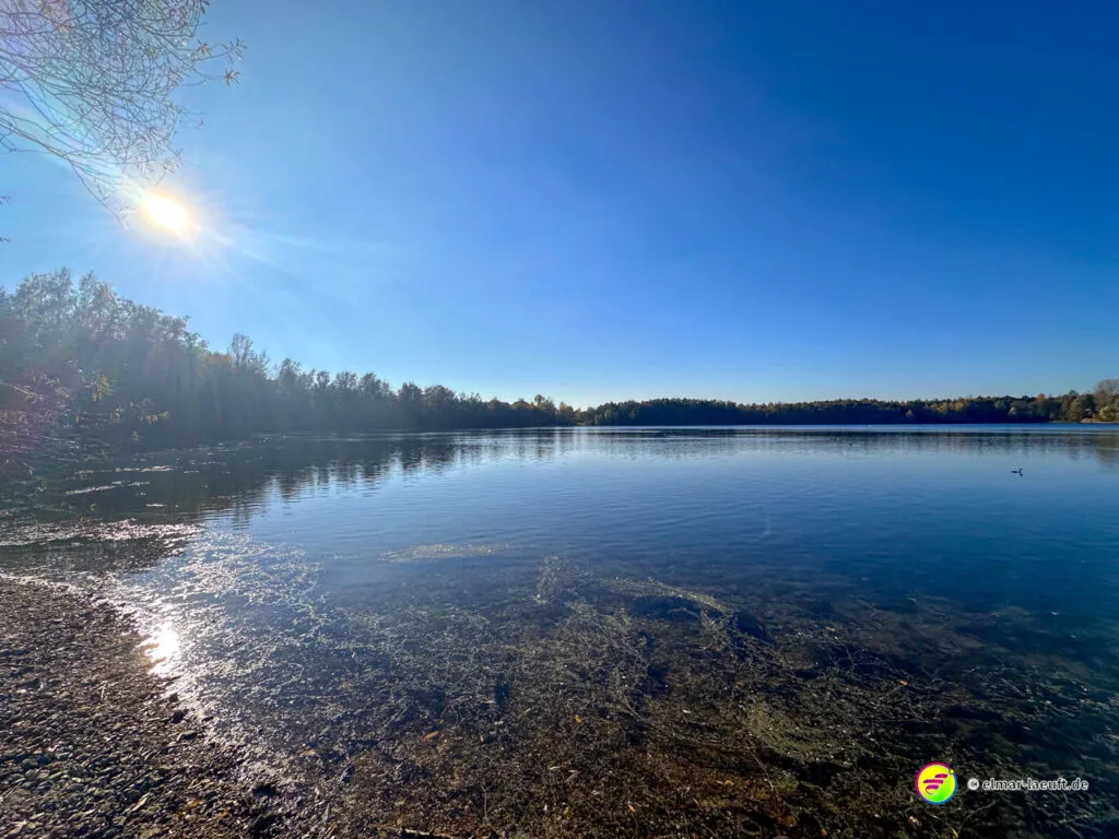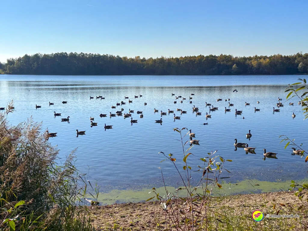 Am Horizont meines Blickfeldes pustet das Kraftwerk Niederaußem kleine, weiße Wölkchen in den ansonsten wolkenlosen, blauen Himmel und ich nähere mich dem Peringsmaar, einem künstlichen See in einem Tagebaurestloch. Nun stehe ich am See und sehe immer noch die kleinen Wölkchen, die noch mehrheitlichen grünen Bäume spiegeln sich auf dem stahlblauen Wasser des Sees. Ein unglaubliches Bild. Die kleinen, zugänglichen Mulden am See sind offenbar beliebte Plätze und so sind einige der eher kleinen Plätze mit Besuchern belegt.