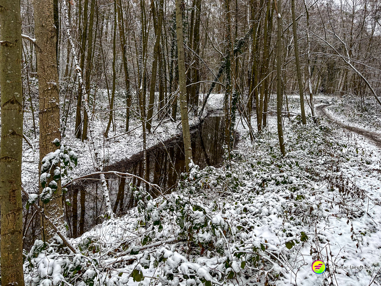 Das Laufen auf teils geteerten Straßen, schottrigen Pisten und schmalen Waldwegen erinnerte mich ein wenig an meine Touren rund um Aachen und Vaals (Trailrun rund um Aachen und Vaals), nur eben mit winterlichem Twist. Es fasziniert mich immer wieder, dass ich den Weg nicht genau kenne – heute hieß das zwischendurch auch mal, über ein Feld zu improvisieren, das unter der Schneedecke verborgen war, oder vorsichtig durch einen Bach zu waten, dessen Oberfläche bereits gefroren war. Diese kleinen Abenteuer machen jeden Lauf einzigartig und bringen genau die Freiheit mit, die ich so liebe.