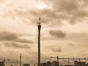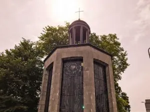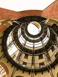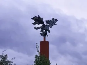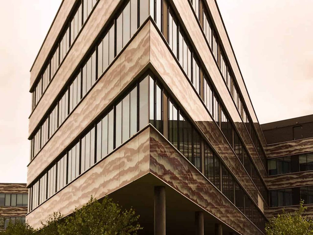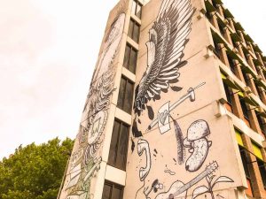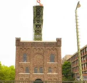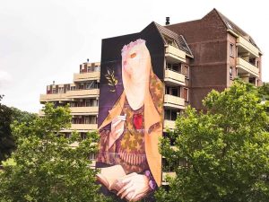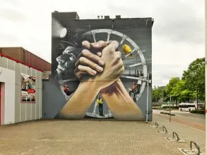 Im weiteren Verlauf entdecke ich mehrere interessante Gebäude. Das ist zum einen das Centraal Bureau voor de Statistiek mit einer Grundform wie ein Windrad und spitz zulaufenden Gebäudekanten. Die Fassade ist mit durchsichtigen Platten, die mit einer Art Holz-Textur bedruckt sind, verkleidet. Gefolgt etwas weiter wird das von einem Gebäude mit einem Förderturm, dem Nederlands Mijnmuseum. Das nächste Haus ist eigentlich recht normal, sticht aber durch ein enormes schwarz-weiß Artwork auf der Fassade hervor. Hier in Streetview sieht man es von vorne. Von dort aus endet mein Weg an einer Treppe zu einem ebenfalls ungewöhnlichen Gebäudekomplex mit dem Namen Maankwartier , das eine Mischung aus Wohn- und Arbeitsräumen zu sein scheint. Ich laufe die Stufen hinauf und blicke auf das Nachbargebäude, auf dem ich ein riesiges Streetart in Form einer Jungfrau mit Patronengürtel entdecke. Ich recherchiere das und lerne, dass dies ein Bild des chilenischen Straßenkünstlers INTI ist. In jedem Fall beindruckend. Zur anderen Seite blickend entdecke ich in der Mitte des Maankwartiers einen Turm mit einer Stahlkonstruktion, auf deren oberen Ende eine große Sonnenuhr thront. Ich verlasse den Komplex über die Treppe auf der anderen Seite und finde auf weiteren Gebäuden große Artworks.