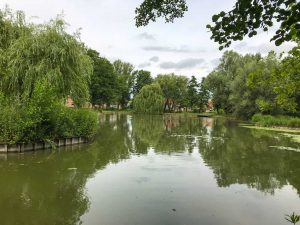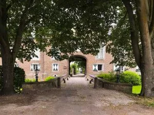 Hier ist es deutlich ruhiger, ich durchkreuze kleine, ruhig Orte mit Reihenhäusern. Ich verlasse die Hauptstraße und bestaune das riesige Gelände des Golfclubs Hoenshuis. das mich durch eine gigantische Baumallee Richtung Ten Esschen führt. Am Ende der Allee liegt das Kasteel Puth, leider ist auch das nicht zugänglich. Daher laufe ich für einen besseren Blick um das Schloß herum. Alle Bäume auf dem Weg sind mit einem Absperrband mit der Aufschrift “Eichenprozessionsspinner” verziert – das hinterlässt ein mulmiges Gefühl bei mir, ich laufe aber trotzdem diesen Weg weiter.