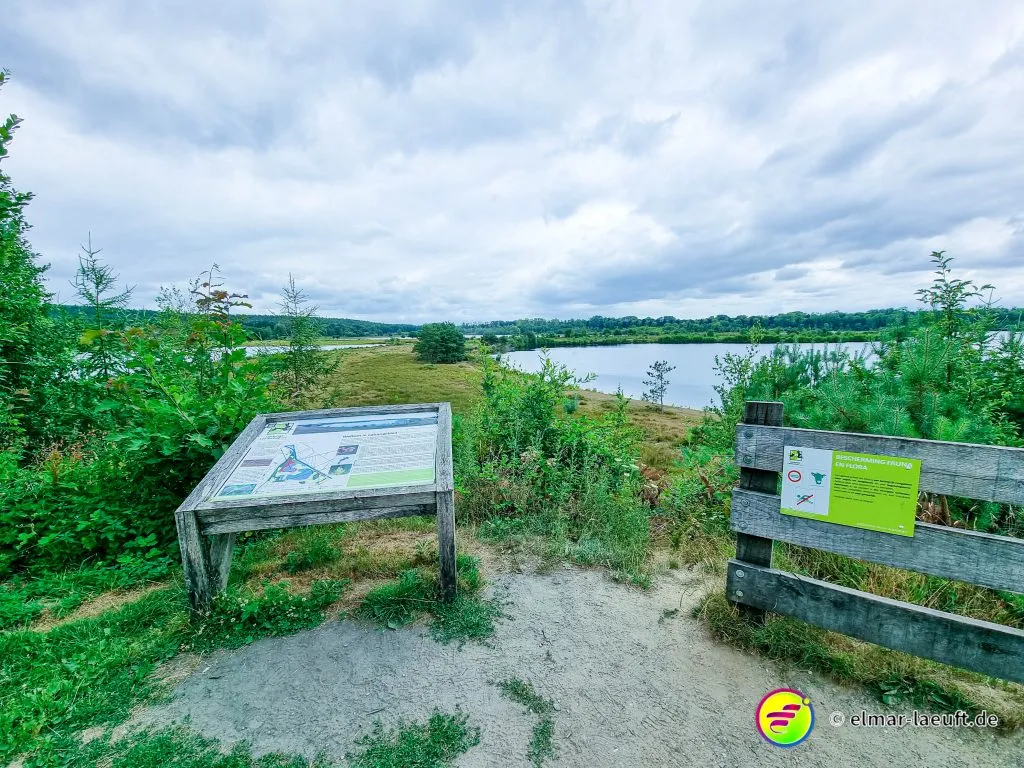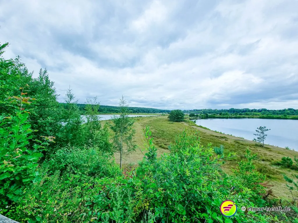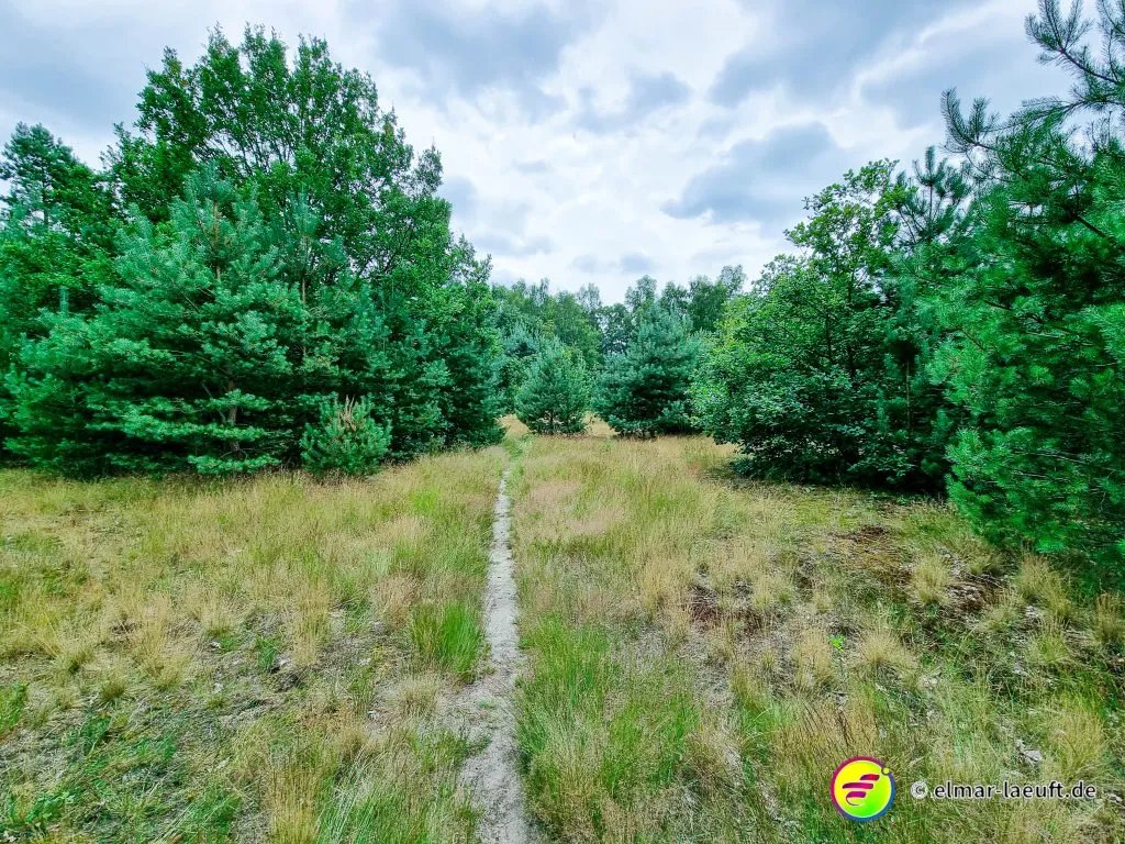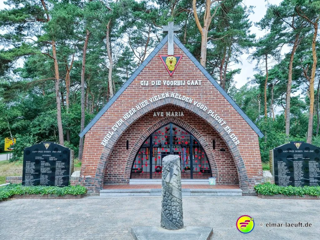 Ein kleiner Pfad lotst mich durch das heideähnliche Gebiet bis zu einer Querstraße mit einer Gedenkkapelle, um dann wieder in den Tiefen des Grüns zu verschwinden. Die Seen des Bergerven sind mit einem Zaun abgesperrt, ich umlaufe die beiden Gewässer, bis ich schließlich wieder auf den Kanal treffe.