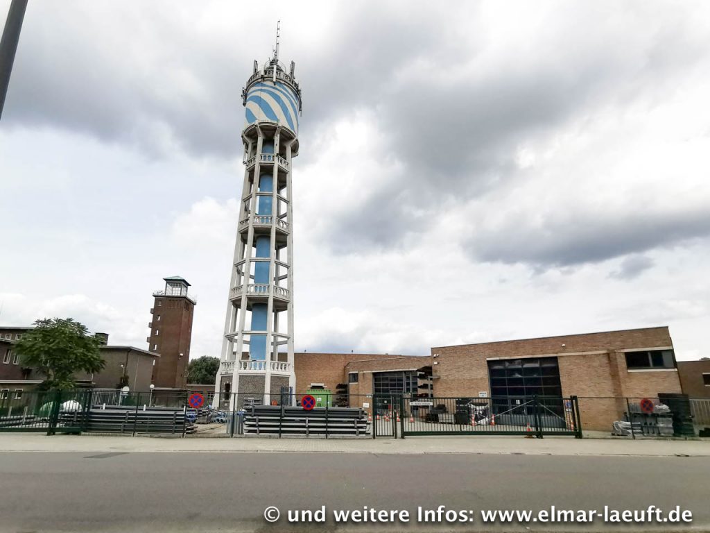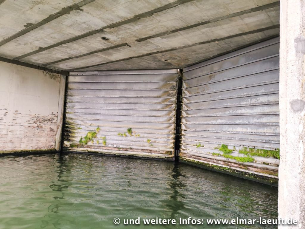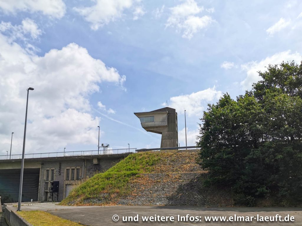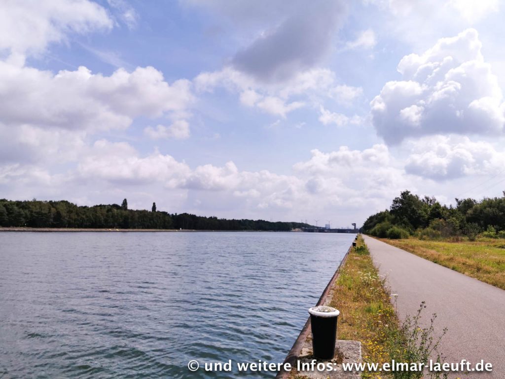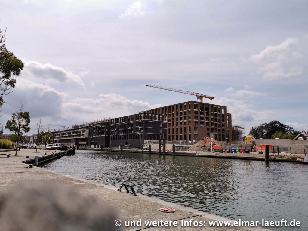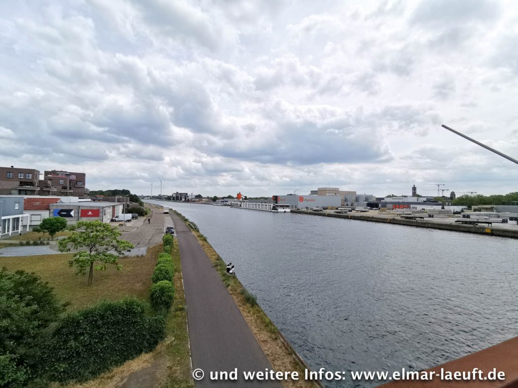Ich bin irgendwo im einem Wohngebiet. In der Nähe befindet sich der Albert-Kanal, ein Nebenarm der Maas. Ich muss ja eigentlich nur die Straße entlang laufen und treffe unweigerlich auf das Wasser – soweit die Theorie. Laut Karte wäre ich an einer Brücke ausgekommen, als ich schließlich aber das Wasser erreiche, ist die Brücke einen Kilometer weit entfernt. Ich sehe aber das Bauwerk aus der Ferne: eine Brücke über eine Schleuse. Ich laufe bis zu dem Bauwerk, an dessen Fuß ich eine Stahltüre vorfinde. Natürlich steht diese auf und wo sollte sie anders hinführen als oben auf die Brücke hinauf? Ab durch das Treppenhaus, in dem ich halbfertige Räume mit Bauschutt vorfinde und eine Menge Tauben, die missbilligend an mir vorbei durch das Treppenhaus fliegen. Immerhin komme ich oben auf der Brücke wieder an das Tageslicht, nur leider hinter dem Zaun auf dem Betriebsgelände der Schleuse. Na gut, die kleine Absperrkette ist kein Hindernis. Ich bin wieder frei.