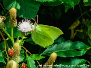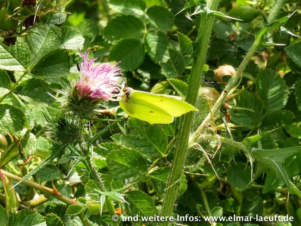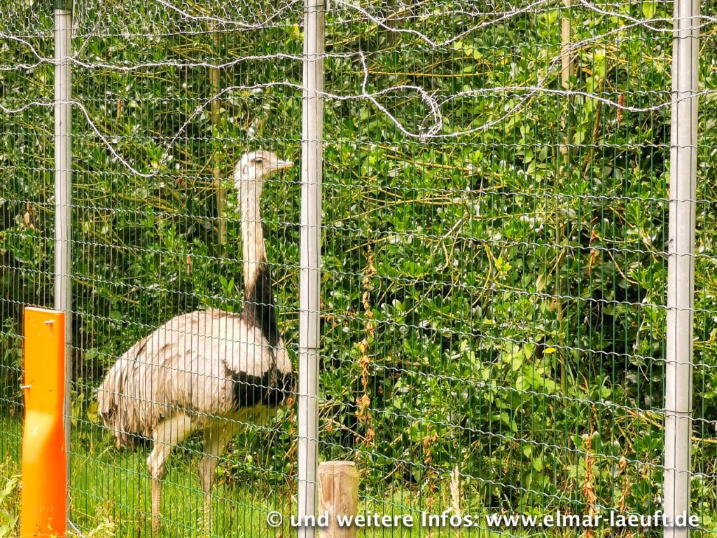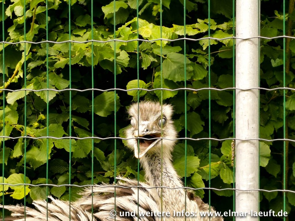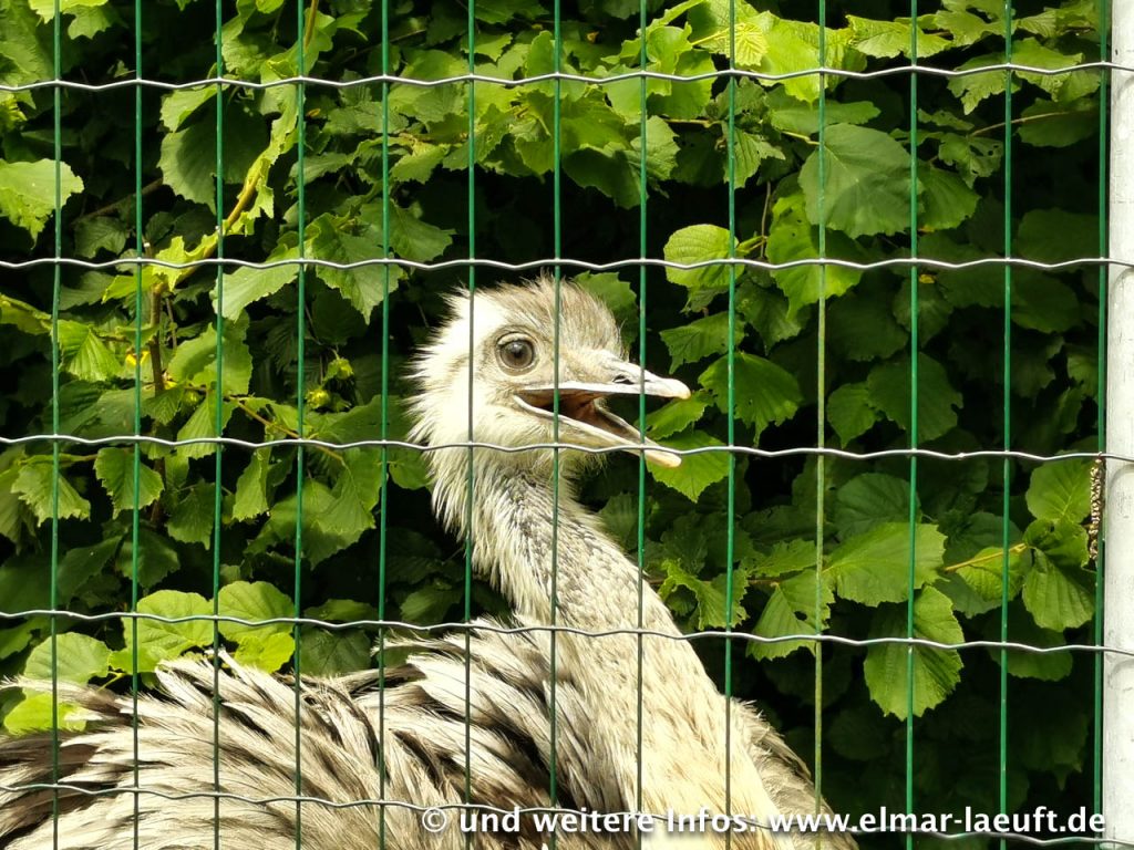 Auf der anderen Seite des Kanals laufe ich an einer Art Kläranlage vorbei in eine Sackgasse. Sackgassen? – für Fußgänger gilt so etwas natürlich nicht! Am Zaun entdecke ich einen kleinen Trampelpfad, über den ich mitten in ein blühendes Biotop eintauche. Hier wimmelt es von Schmetterlingen, Bienen, Gräsern und Beerensträuchern. Ein guter Test für den Zoom meiner Handykamera. Ich versuche mich ruhig zu verhalten, stehe still und warte bis die Schmetterlinge in weiß, gelb und braun-rot sich auf den Blumen niederlassen. Das ist gar nicht so einfach, denn so lange bleiben die Tiere leider nicht auf einem Fleck sitzen. Einige Fotos gelingen mir aber, wenn auch nicht ganz optimal. Am Ende des Trampelpfades treffe ich auf einen recht soliden Zaun. Von der anderen Seite starren mich eine Reihe von Emus an. Die sind offenbar “not amused” über mein Eintreffen und drücken das mit weit offenem Schnabel und geduckter Haltung aus. Wir trennen uns nach einigen hundert Metern in Frieden.
