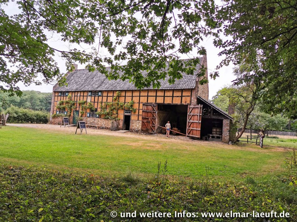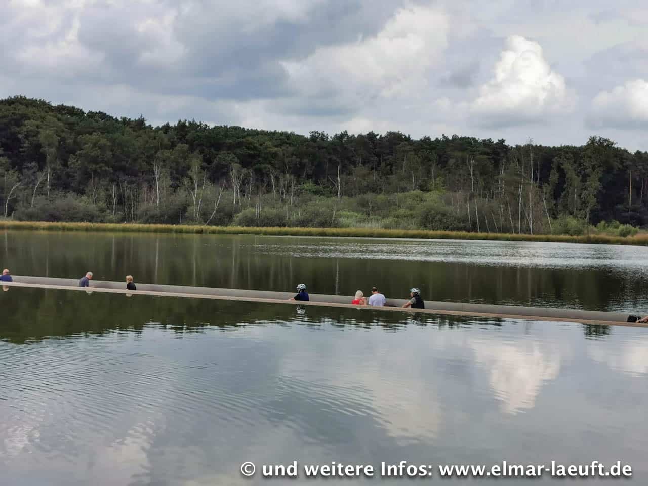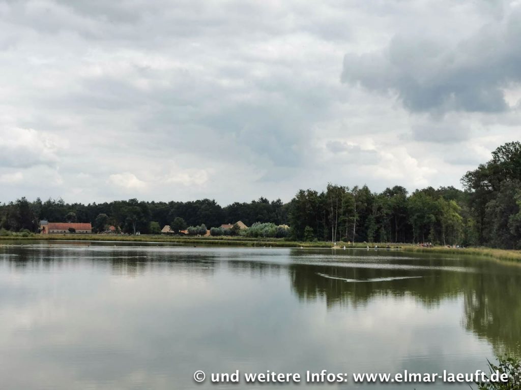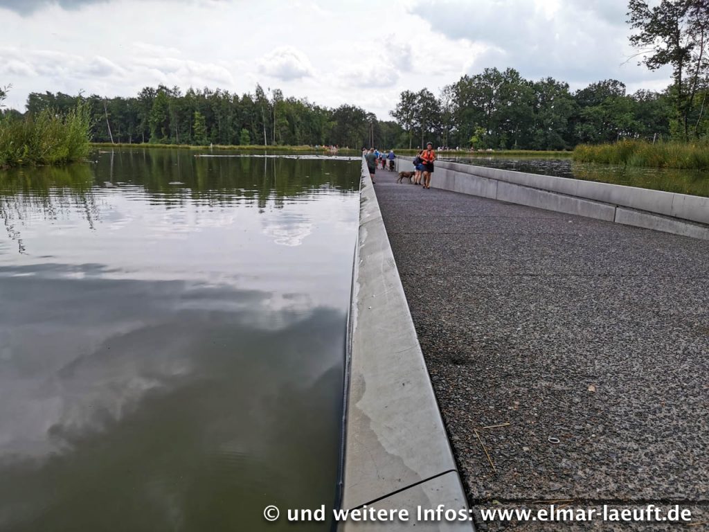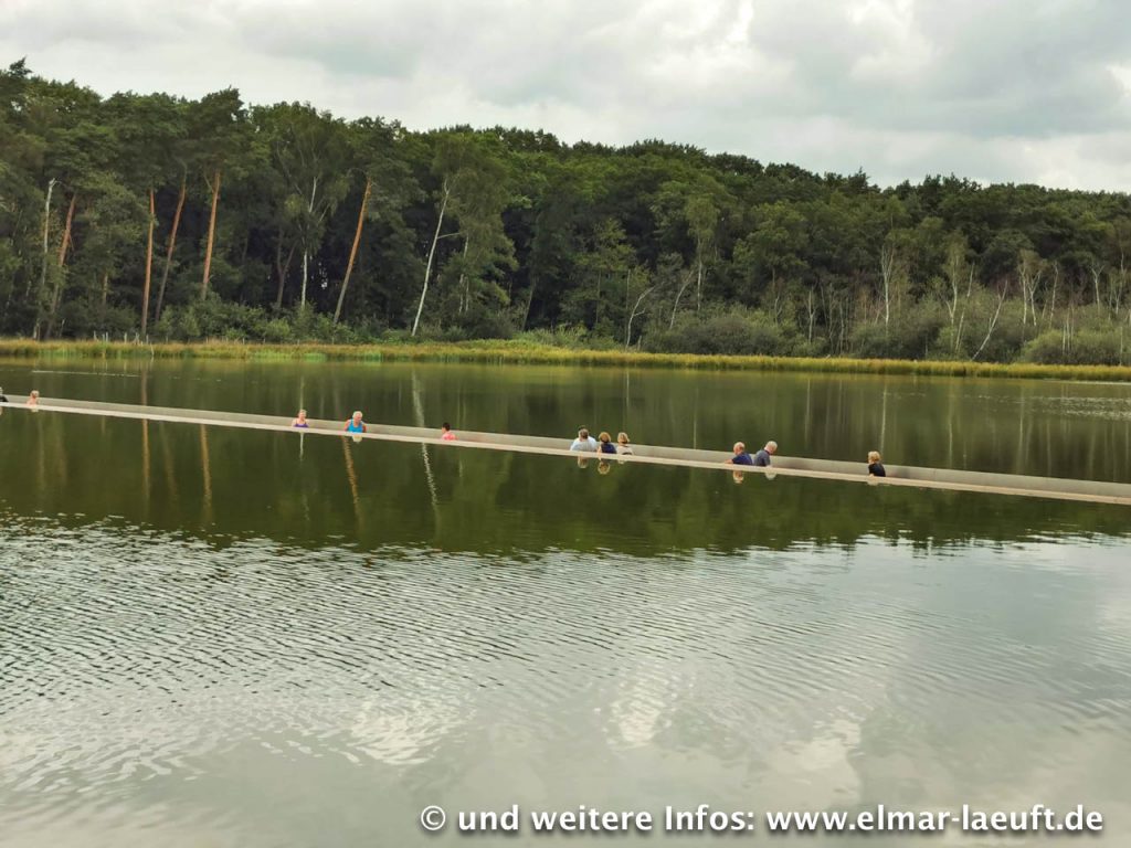 Vor mir liegt das Areal des Freilichtmuseum Bokrijk. Ich passiere Parkplatzanlagen und Unmengen von Pilgern, die auf den zentralen Eingang zuwandern, über dem ein großes LED-Schild mit Aufschrift “CASH” leuchtet. Museum? Eintritt! Es ist recht voll und eigentlich habe ich keine Lust für diese kleine Zwischenstation Geld hinzulegen. (Joggen im Museum wäre auch irgendwie doof). Daher laufe ich Außen um das Gelände herum. Das haben sie echt nett gemacht. An einer Stelle versammeln sich eine größere Menge Menschen, neugierig geselle ich mich dazu. Ok, das ist ein See und mittendrin führt ein schmaler Weg in den See hinein auf ca. einen Meter unterhalb des Wasserspiegels. Ich gehe hinein und blicke Auge in Auge zu den Enten, die direkt neben mir am Rand der Absperrung mit ihren Kindern schwimmen. Mitten durch einen See zu gehen – das hat etwas.