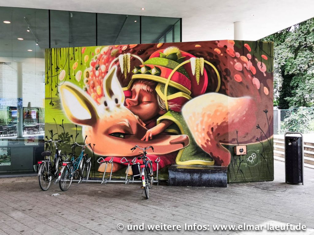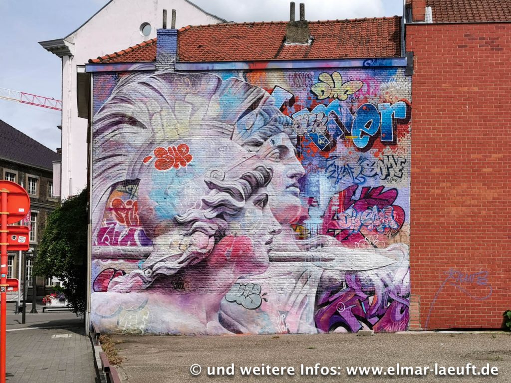 Ich verlasse den Wald, entkomme der Natur und steure auf den Ort Hasselt zu. Nach dem Besuch anderer Orte hier ist meine Erwartung wirklich nicht hoch. Aber ich täusche mich – das ist ein nettes Städtchen, es hat Charme, schönes Häuser eine Altstadt. Und eine Menge großer und kunstvoller Graffitis, die ich an diversen Hauswänden entdecke. Meine Reise ist fast zu Ende, es fehlt noch der japanische Garten. Habe ich wirklich gedacht, ich würde da umsonst einfach hinein laufen können? In Google Maps war es halt nur irgendein grüner Klecks. Auch diesen Eintritt spare ich mir und folge dem Zaun des Gartens außen herum und gelange an eine zweispurige Schnellstraße. Diese müsste ich jetzt nur noch überqueren und wäre bald am Ziel. Leider hat man eine großflächige Baustelle eröffnet und die Straßen sind sehr voll, an überqueren ist hier nicht zu denken. Ich kann aber sehr einfach auf einem Grünstreifen in die Baustelle hinein und neben der Straße weiter laufen. Das geht auch prima, nur ist am Ende der Baustelle der Bauzaun fest mit einem Gebäude verbunden. Umständlich klettere ich über das Alugeflecht, bleibe hänge und rutsche auf der anderen Seite hinunter. Bein aufgerissen, Hose aufgerissen – alles richtig gemacht. Mit kaputter Hose, einigen Schrammen und einem Rekord von 29km Laufstrecke beende ich meine Runde für heute.