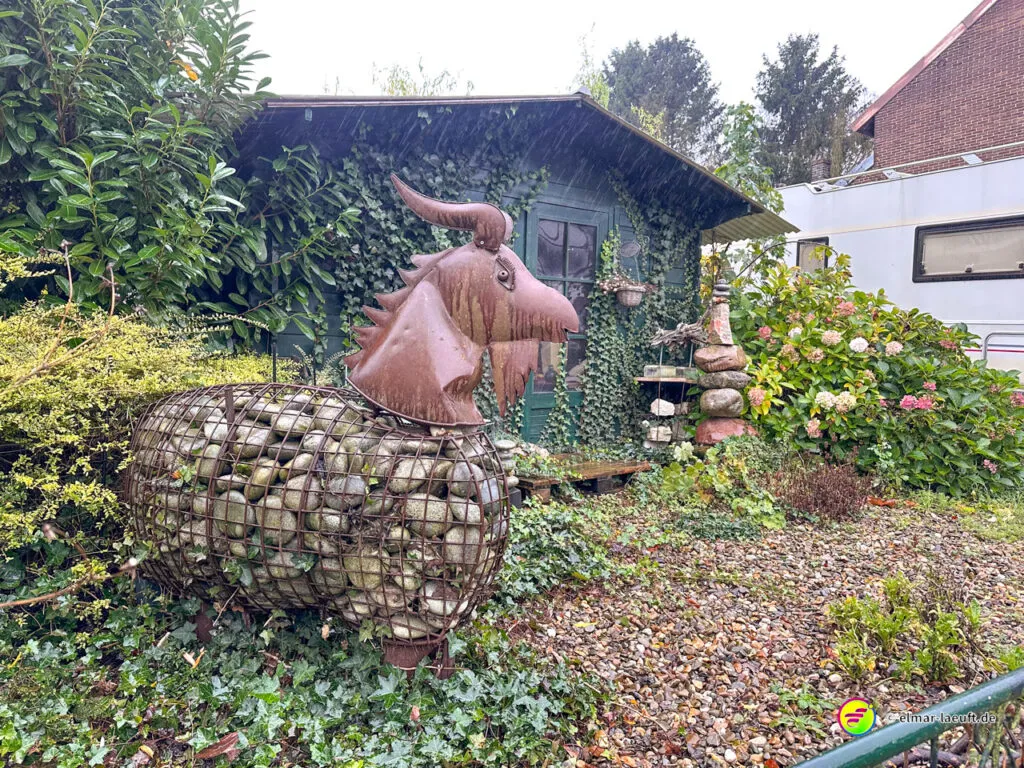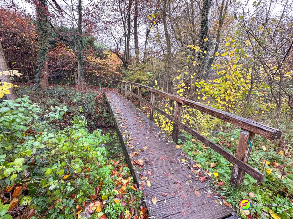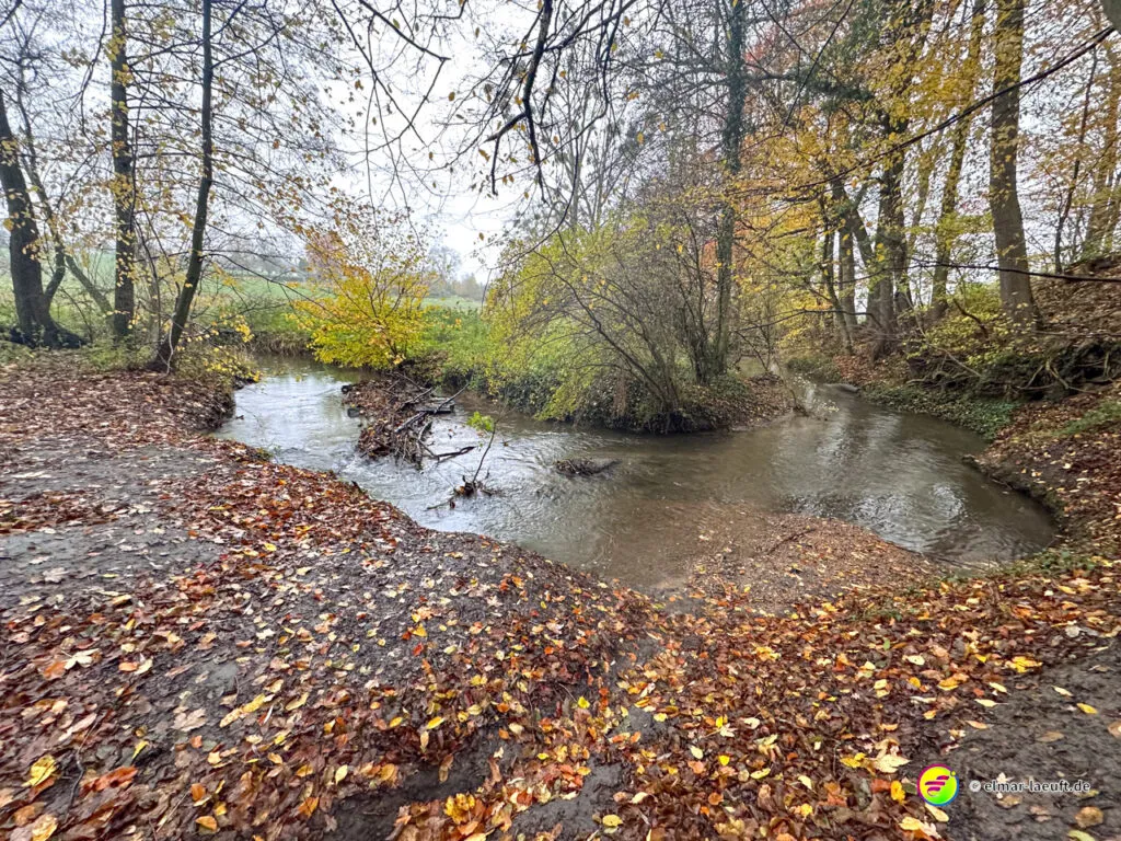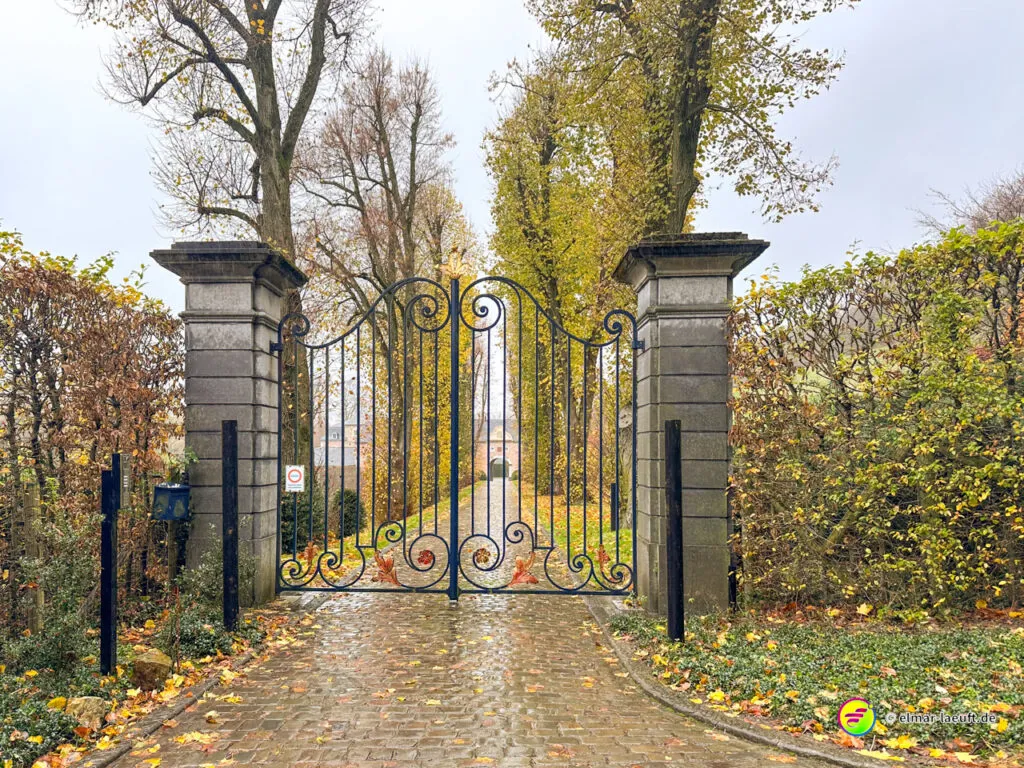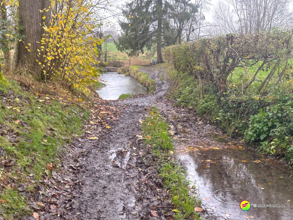 Ein nur schulterbreiter Weg zwischen zwei Häuserreihen geleitet mich auf einen Feldweg entlang des Flüsschens Gulp. Der Name des Weges, “Grote Bosweg”, steht im krassen Gegensatz zu der von Rand zu Rand ragenden, schmalen Schlammpiste, dem ich gelegentlich über einzelne Grasstreifen auszuweichen vermag. Nach einigen Minuten bemühe ich mich nicht einmal mehr, mit den Füßen eine trockene oder gar feste Stelle auf dem Boden zu treffen.