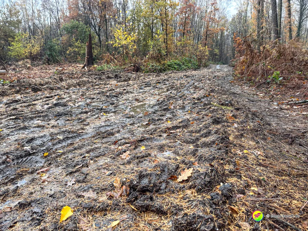 Aber, ich habe die Rechnung ohne das Bosverservaat Teuvenberg gemacht. Ich laufe nicht einmal und dennoch gelingt es mir nicht trittsicher durch den nach Rodungsarbeiten total durchweichten Waldweg zu gehen. Zack, und schon liege ich wieder im Matsch.