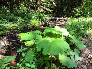 Schließlich stehe ich vor einem Stapel Holz und stelle fest, dass die Raupe hier die Arbeit beendet haben muss. Nun gut, ich bin aber jetzt im Wald, das wollte ich ja auch. Und irgendwie sieht der Boden hinter dem Holzstapel zwischen Farn und Brennnesseln so aus, als wäre da auch vor mir schon jemand weiter gestapft. Ich finde es heraus und folge dem vermeintlichen Trampelpfad weiter in den Wald hinein. Hier ist es grün, kühl und der Boden ist weich. Das macht richtig Spaß. Ich gelange offenbar wieder auf den Hauptweg und wiederhole die Vorgehensweise mit anderen Wegen erfolgreich noch ein- oder zwei Mal.