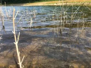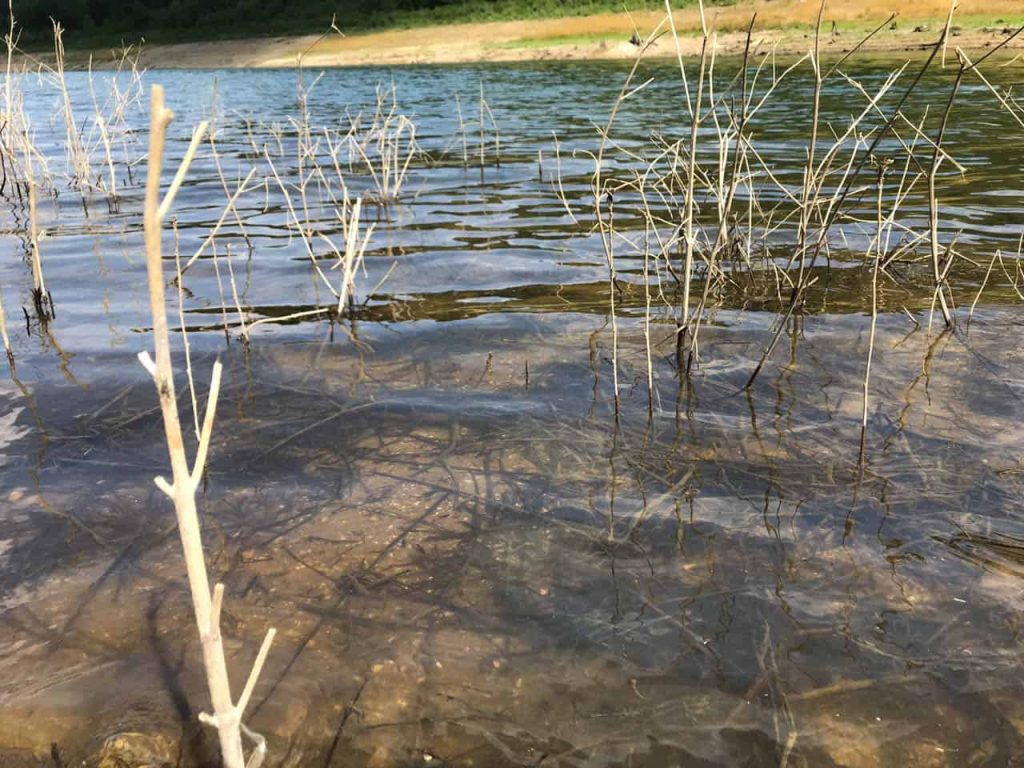 Schließlich kann ich weiter in meine gewünschte Richtung und stelle fest, dass ich laut Karte offenbar mitten im See stehen muss. Klar, die lange Hitze: der See ist hier schon ausgetrocknet. Der See teilt sich in mehrere große Arme auf und ich überquere hier den zweiten. Wer kann denn auch wissen, dass jeder Arm in einem eigenen Tal liegt. Der nächste Weg führt mich wieder über 50 Meter bergauf. Immerhin scheine ich durch meine Waldwege einige Kilometer eingespart zu haben. Der letzte Abstieg führt mich an den dritten Arm des Sees, den ich nun umrunde.