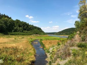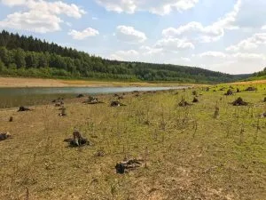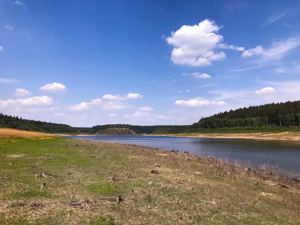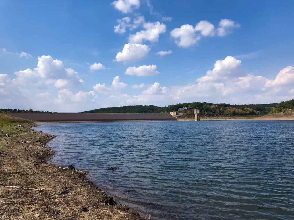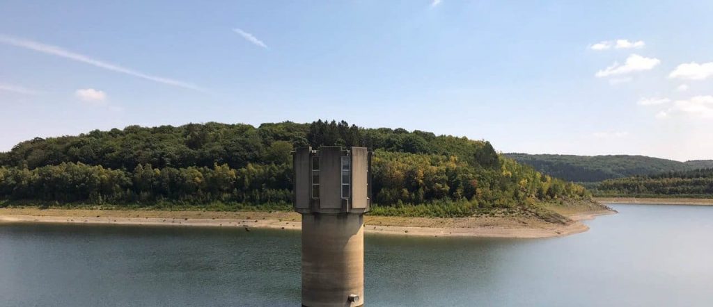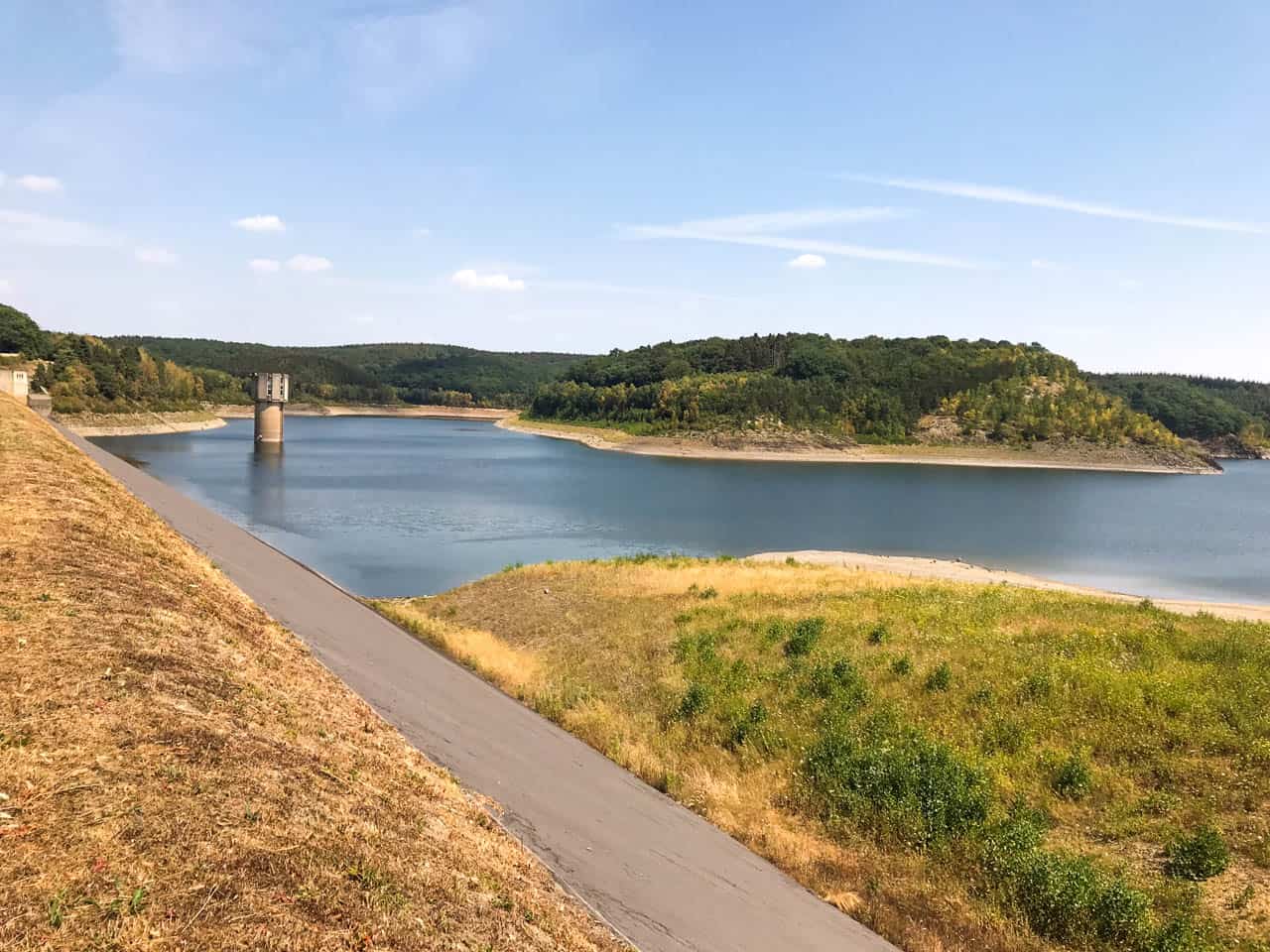 Ich starte bei knackig-sonnigen 29° auf dem Schotterplatz der Talsperre. Meine Planung verspricht Wasser und Wald – das ist heute auch mehr als angebracht. Es geht direkt los mit einem Umweg, bevor ich den Damm der Talsperre Wehebachtal erreiche. Der Turm mitten im See zeigt an, dass der Pegel schon stark gesunken ist.