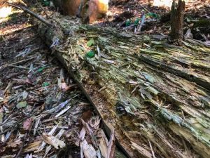 Ich folge dem Weg einige Kilometer und ich stelle fest, dass er sich immer weiter vom See entfernt. Und, durch den Wald verläuft er immer noch nicht. Da kommt mir dieser Feldweg, auf dem kürzlich einen Kettenfahrzeug gefahren sein muss gerade recht. Wenn hier schon eine Raupe oder Ähnliches durch den Wald gebrettert ist, dann kann ich ja zu Fuß auch dort lang. Die tiefen Abdrücke der Raupe machen den Weg etwas schwerer begehbarer, aber ich schlage mich ganz gut.