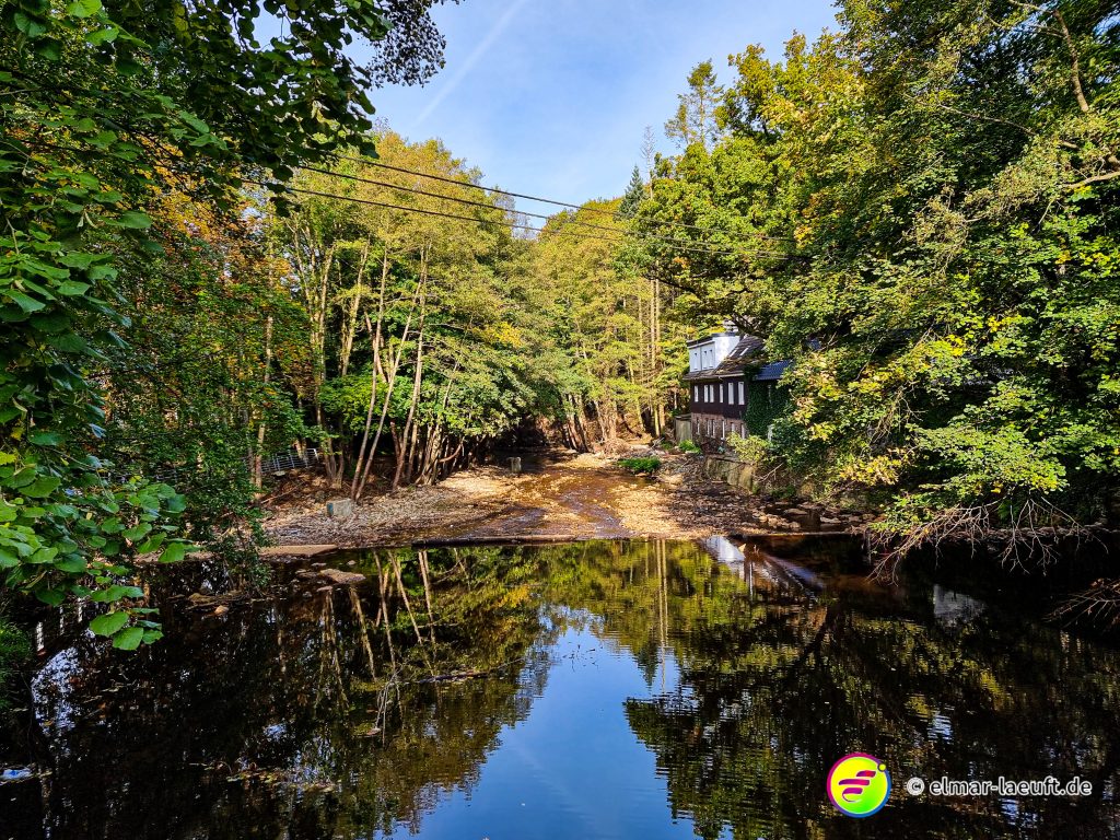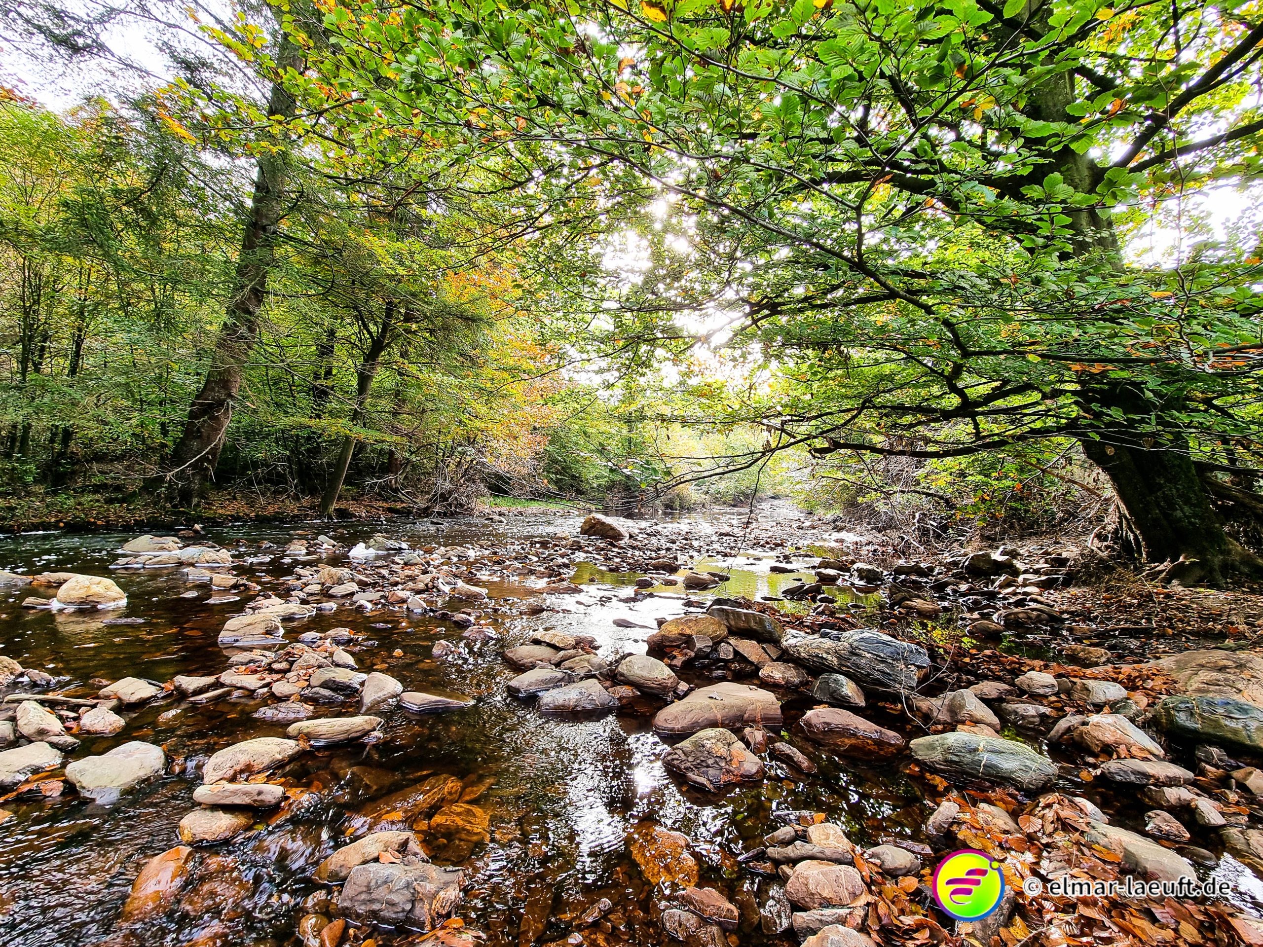 Gut! Mein Weg verläuft also auf der anderen Seite des Flüsschens Hill. Nur wie komme ich hinüber? An vielen Stellen des eigentlich flachen Wasserlaufs befinden sich bunt verstreut große Kiesel. Manche davon ganz unter Wasser, manche ragen hinaus. Das durch die vielen Steine immer etwas gestaute Wasser sucht sich relativ schnell den Weg in den Bachlauf.