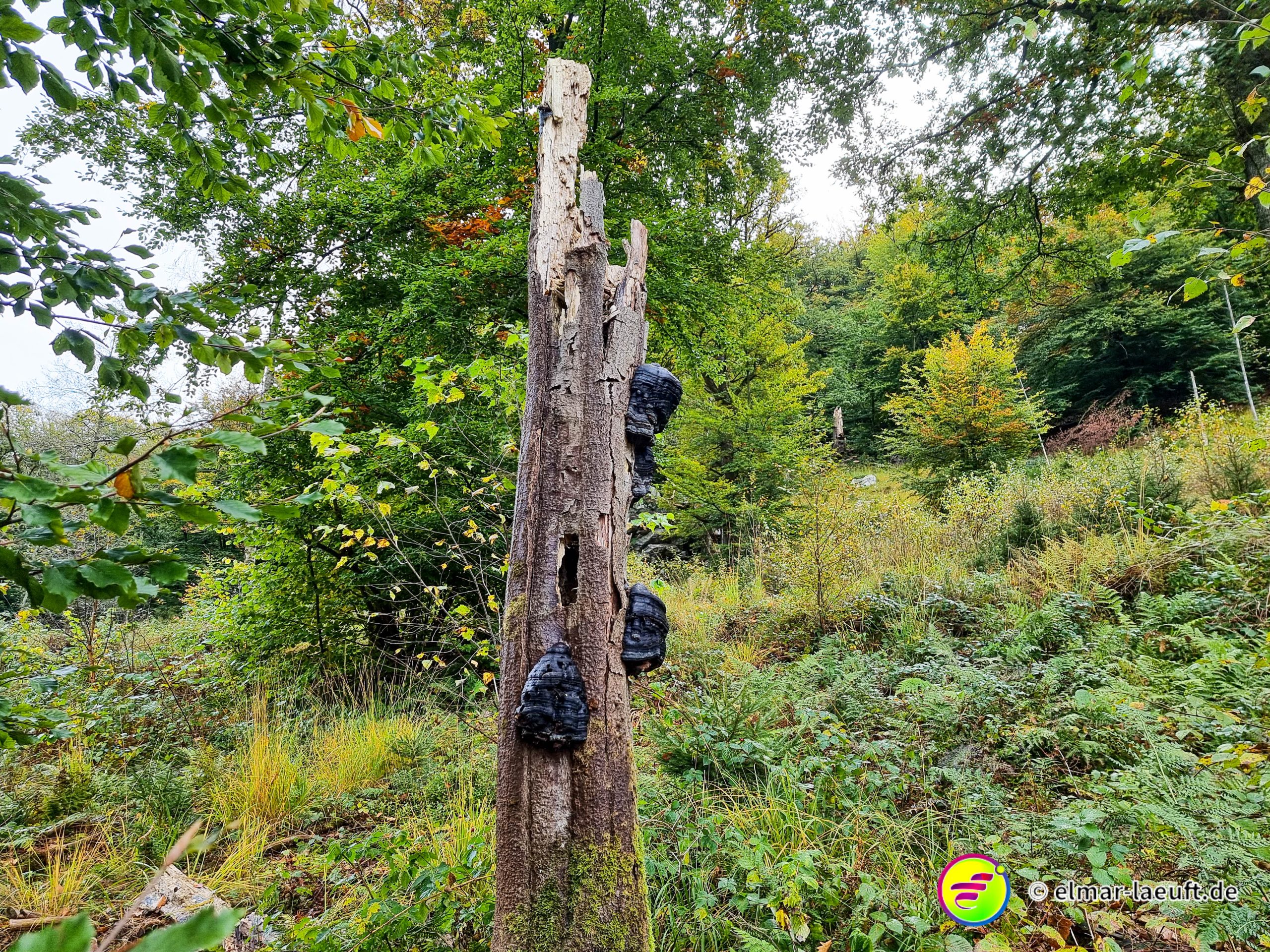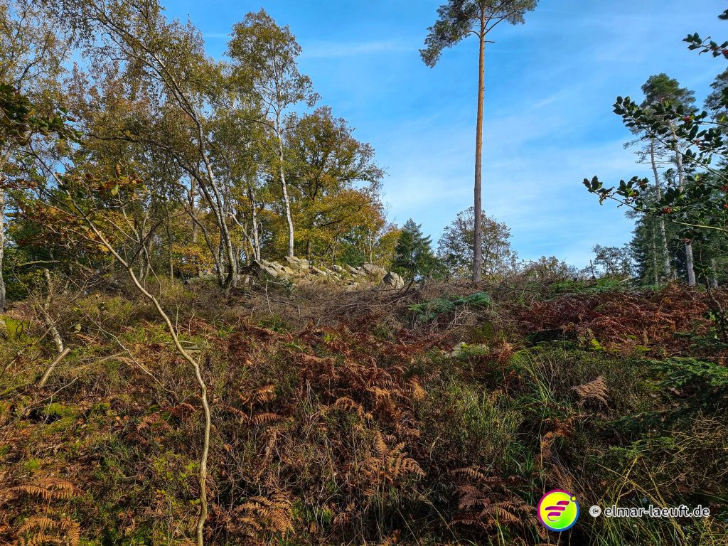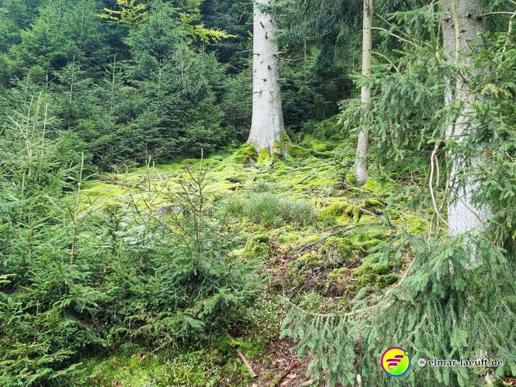 Auf der nun richtigen Seite lauf ich einen Wald mit weichem Moos. Trotz der größeren Höhe befinden sich hier sumpfige Wasserstellen im Wald und prompt rutsche mit einem Bein in ein Sumpfloch und versinke bis zum Oberschenkel. Mit einem lauten Schlürfgeräusch ziehe ich das Bein wieder hinaus und habe nun wirklich sehr naße Füße und ein sehr matschiges Hosenbein.
