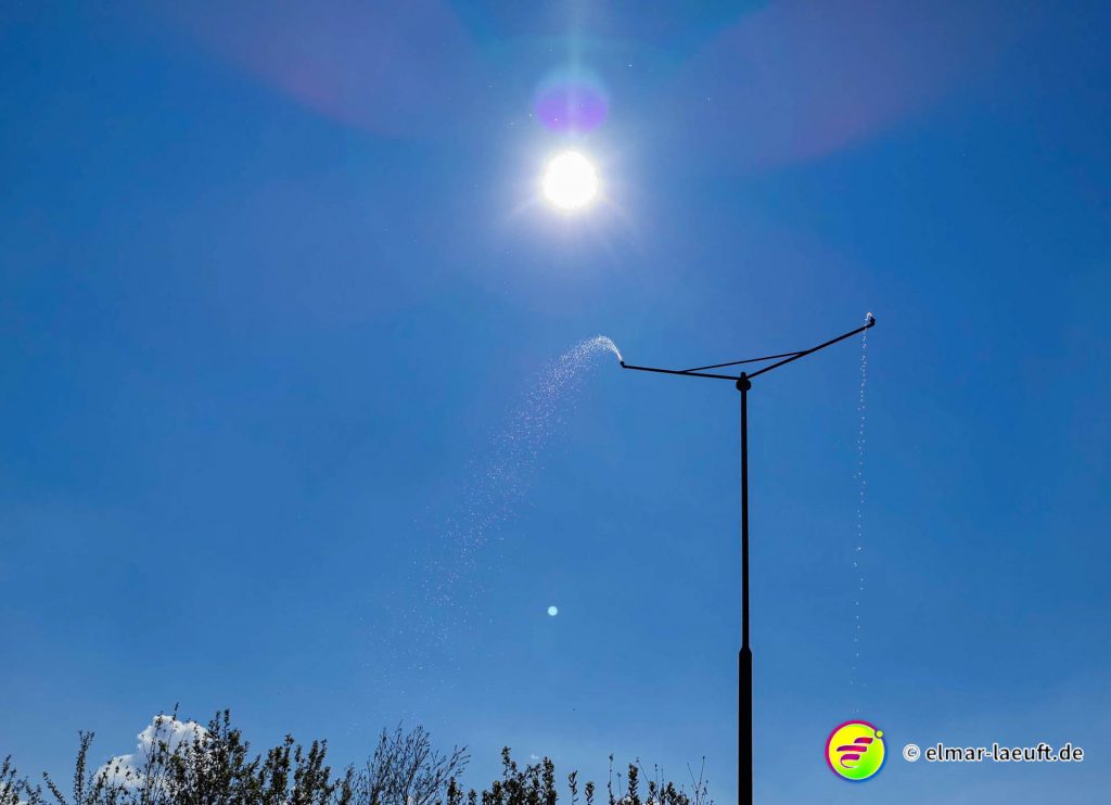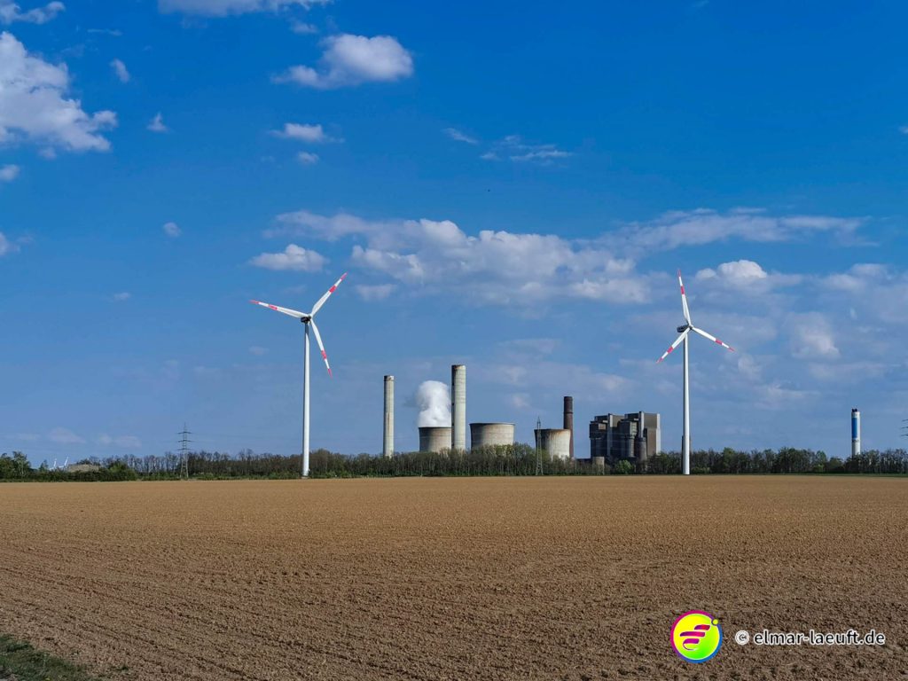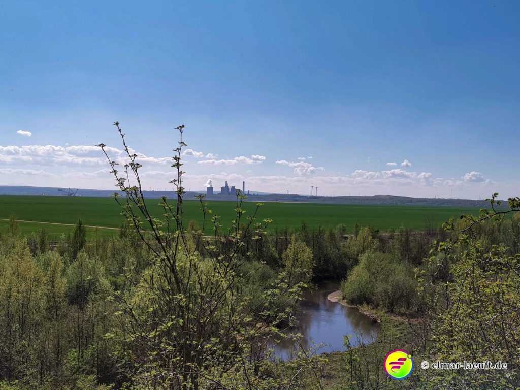 Ich finde auch auf der anderen Seite der Grube zurück zur Inde, der ich eine Weile am Ufer folge. Am Horizont taucht erneut das Kraftwerk Weisweiler auf. Nur dieses mal sehr viel näher. Langsam und fast gemütlich fährt ein dicker Wolkenstrom aus dem Kamin und die weißen Luftmassen verbinden sich weiter oben mit den heute eher spärlichen Wolken am ansonsten stahlblauen Himmel.