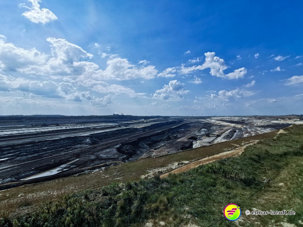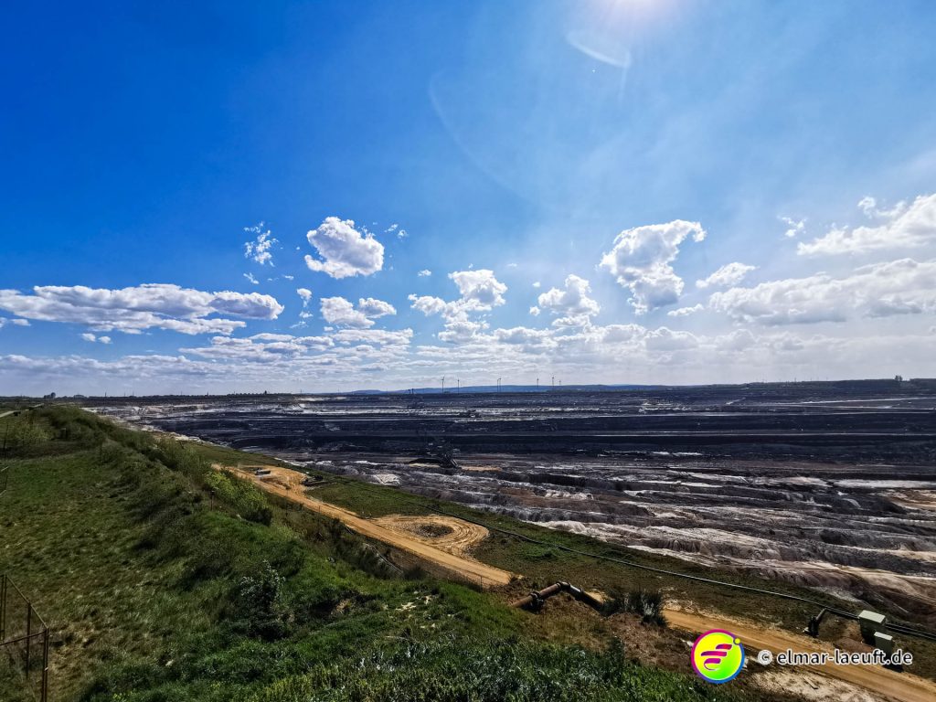 Ich folge der Seitenlinie des Tagebaus. Eine recht triste Angelegenheit, aber man hat jederzeit einen freien Blick auf die riesige Grube. Das gibt mir die Gelegenheit für ein paar interessante Aufnahmen. Am Rand eines Ackers laufe ich auf eine Anhöhe und bin nun auf einer Art Wall, der die Straße vom Baugelände abtrennt. Ich laufe im Prinzip genau auf der Grenze. Nach etwa 20km gelangt der Indemann in mein Sichtfeld.
