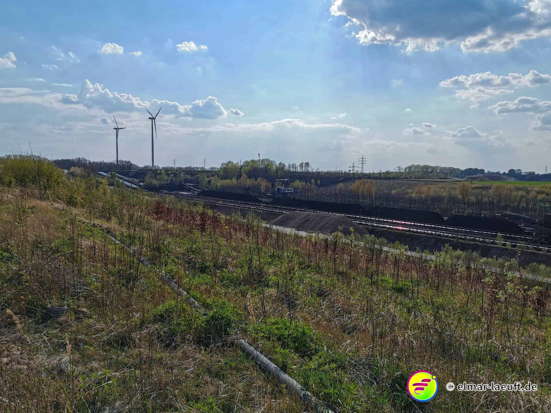 Ich folge der Seitenlinie des Tagebaus. Eine recht triste Angelegenheit, aber man hat jederzeit einen freien Blick auf die riesige Grube. Das gibt mir die Gelegenheit für ein paar interessante Aufnahmen. Am Rand eines Ackers laufe ich auf eine Anhöhe und bin nun auf einer Art Wall, der die Straße vom Baugelände abtrennt. Ich laufe im Prinzip genau auf der Grenze. Nach etwa 20km gelangt der Indemann in mein Sichtfeld.