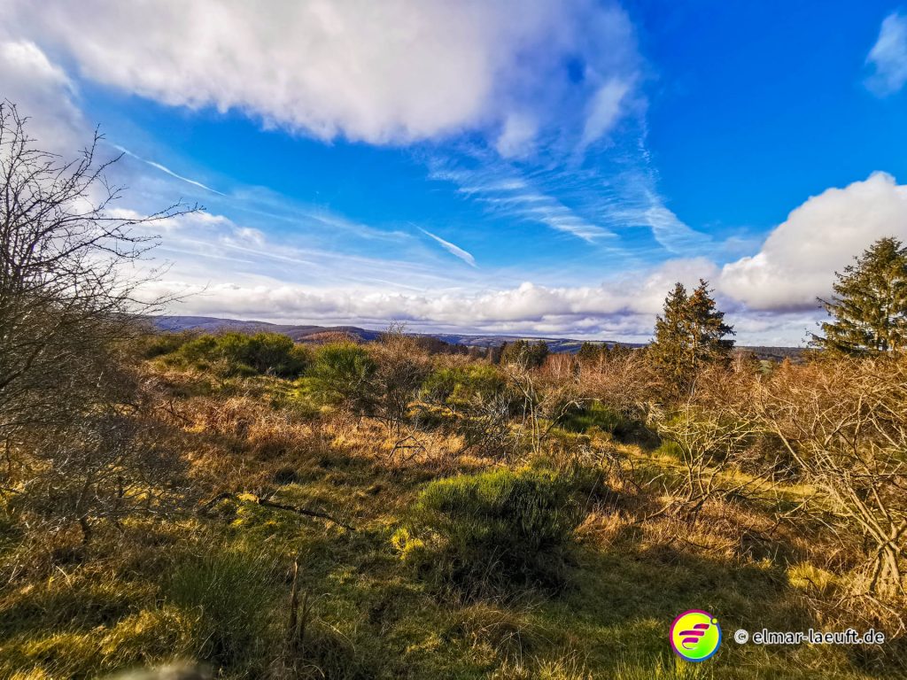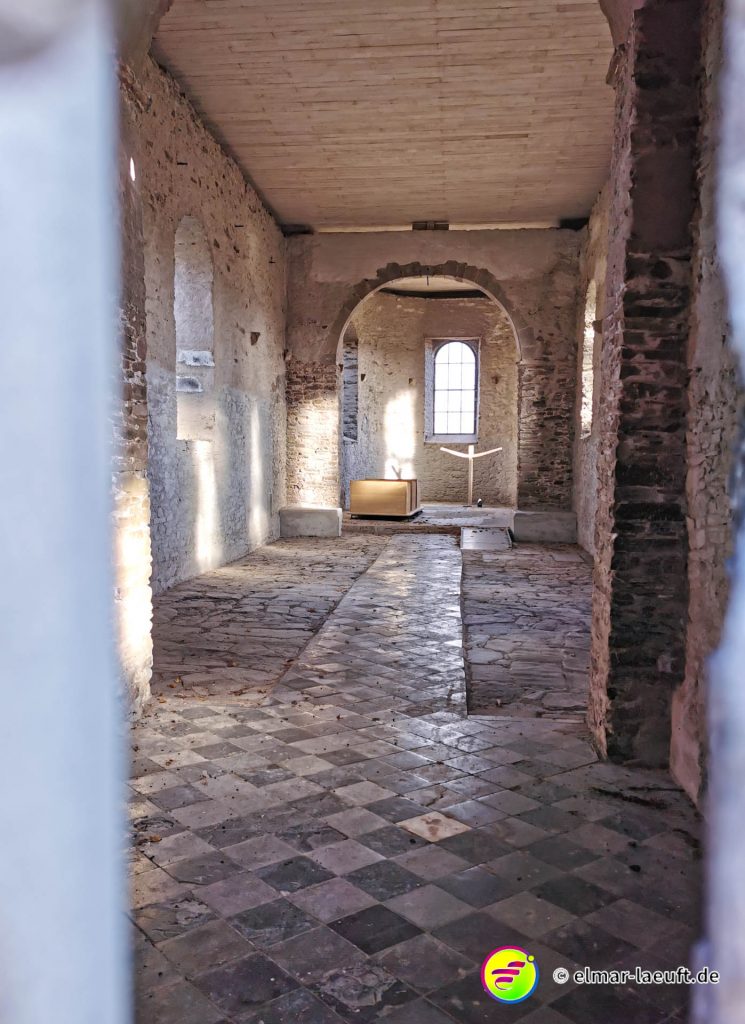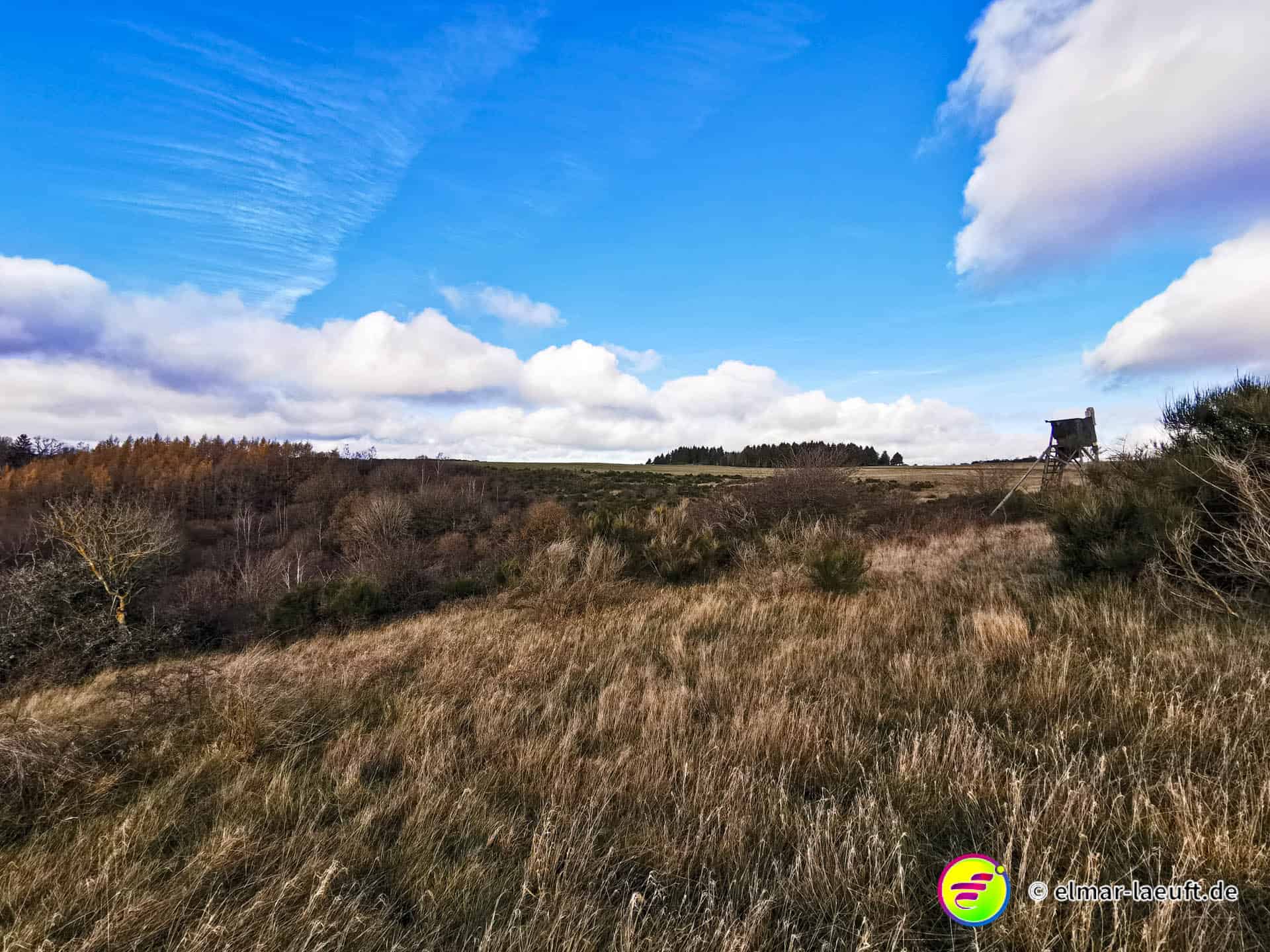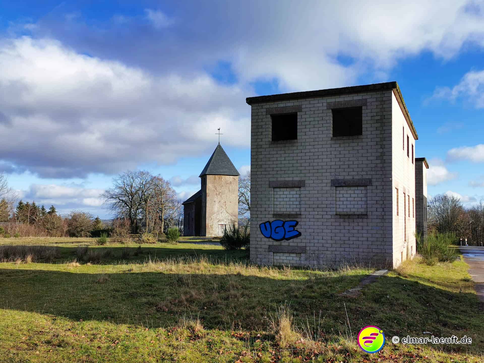 Irgendwann bin ich oben und laufe durch eine herrliche Landschaft aus vertrocknetem Gras, niedrigen Büschen und ein paar wenigen Bäumen. Schließlich finde ich eine Art “Rinne” in der Landschaft, in der ich einigermaßen gut vorwärts komme. Die Rinne endet auf einem der Touri-Wanderwege, diese führt mich nach Wollseifen. Hier sollte einmal ein Truppenübungsplatz für Vogelsang angelegt werden, Häuserkulissen sollten zum Üben des Häuserkampfes dienen. Am Rand des Geländes befindet sich eine Kapelle.