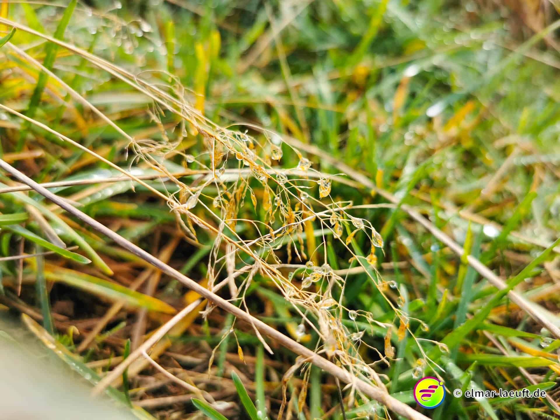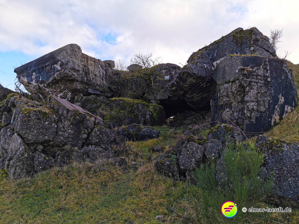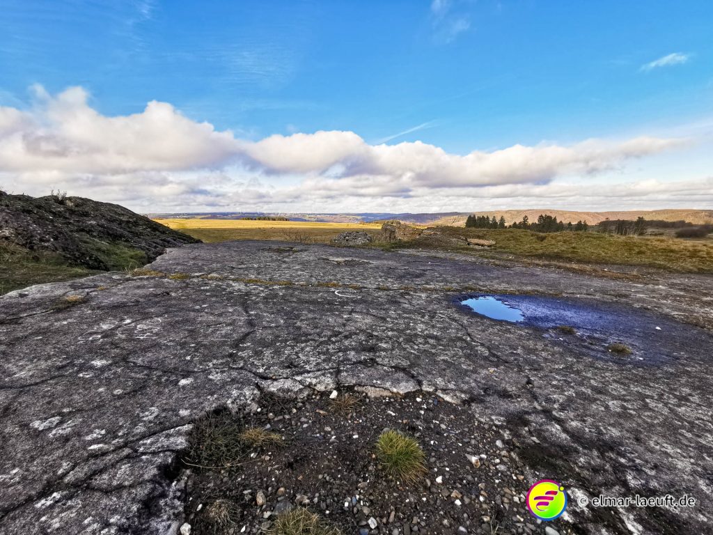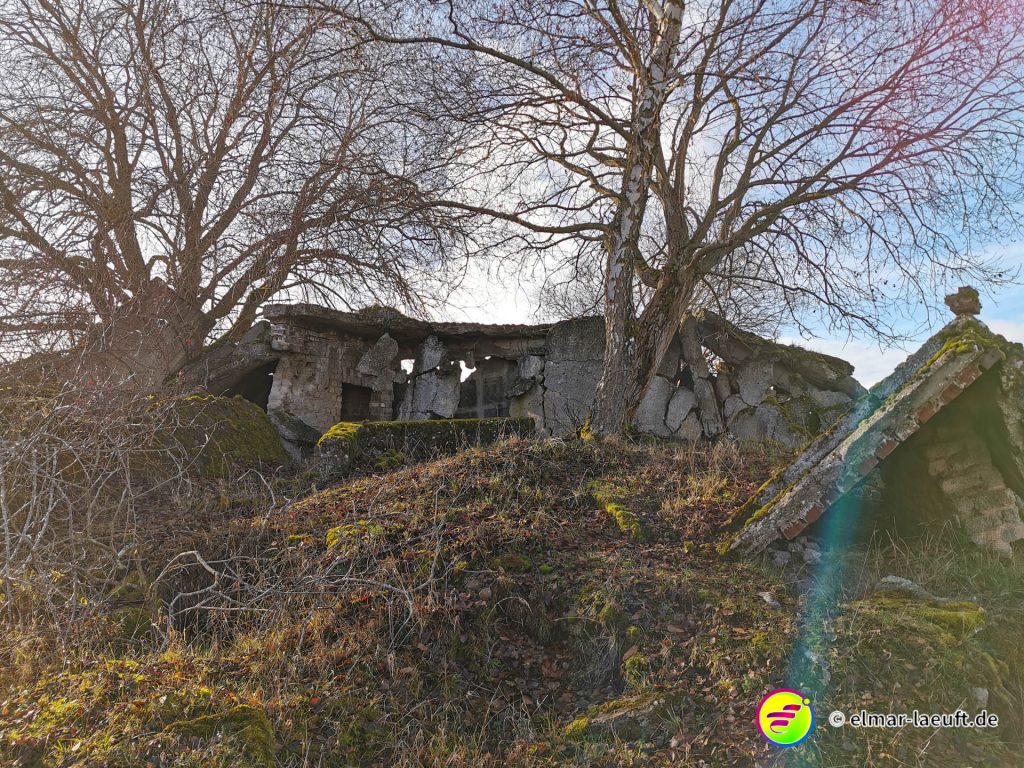 Irgendwann bin ich oben und laufe durch eine herrliche Landschaft aus vertrocknetem Gras, niedrigen Büschen und ein paar wenigen Bäumen. Schließlich finde ich eine Art “Rinne” in der Landschaft, in der ich einigermaßen gut vorwärts komme. Die Rinne endet auf einem der Touri-Wanderwege, diese führt mich nach Wollseifen. Hier sollte einmal ein Truppenübungsplatz für Vogelsang angelegt werden, Häuserkulissen sollten zum Üben des Häuserkampfes dienen. Am Rand des Geländes befindet sich eine Kapelle.