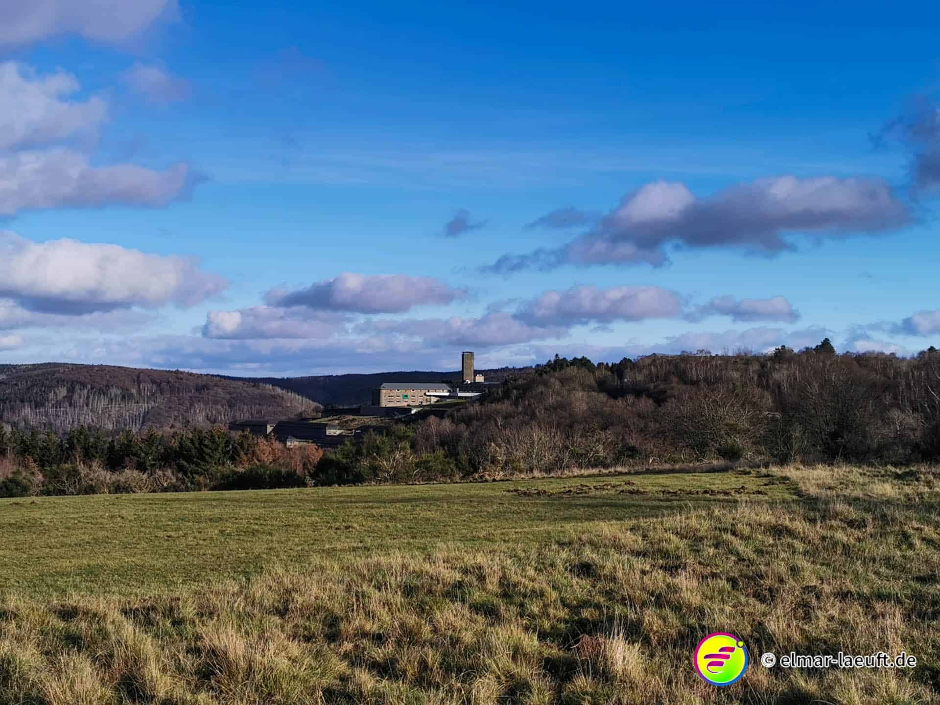 Hinter der Kapelle erwartet mich eine abfallende Ebene mit einem Blick auf die Anlage von IP Vogelsang. Ich laufe den Abhang hinab und suche mir eine schöne Stelle für einen kleinen Drohnenflug. Weiter geht es den Abhang hinab querfeldein bis auf den nächsten Weg. Ich komme aus dem Wald hinaus und stehe zu meiner Verwunderung direkt auf dem Gelände.