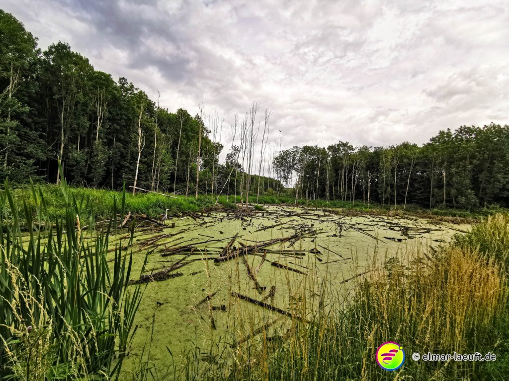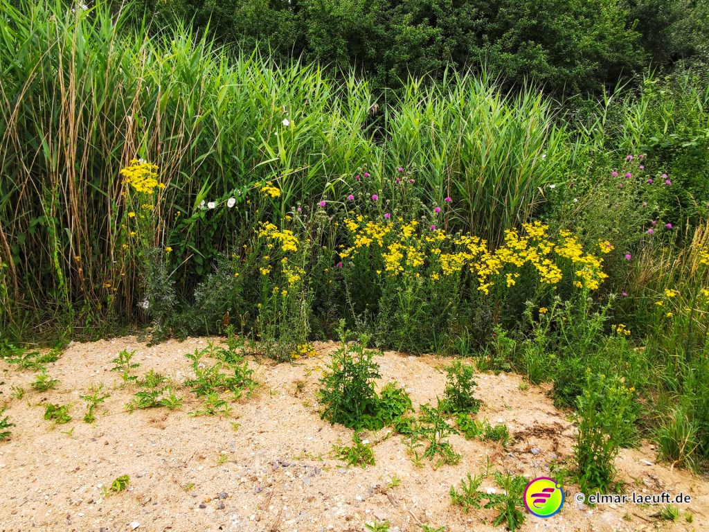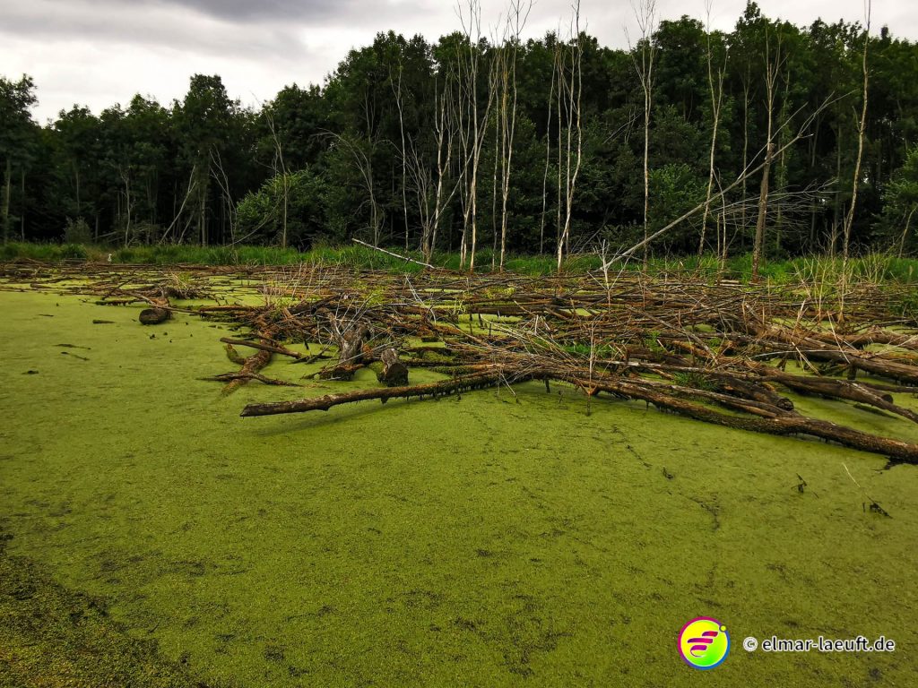 Die zweite Anhöhe trägt den Namen Glessener Kippe. Auch hier schlage ich mich über den seitlichen Abhang die 130m nach oben durch dichtes Grün, Gräser, Bäume, Brennnesseln. Also: ein Paradies für Zecken. Nachdem ich auf der anderen Seite wieder hinunter gelaufen bin, werfe ich einen Blick auf meine hellgraue Hose. Wie zu erwarten tummelt sich eine kleine Sammlung der kleinen Blutsauger auf meiner Hose. Tatsächlich aber nur dort und ich kann die lästigen Krabbler alle entfernen.