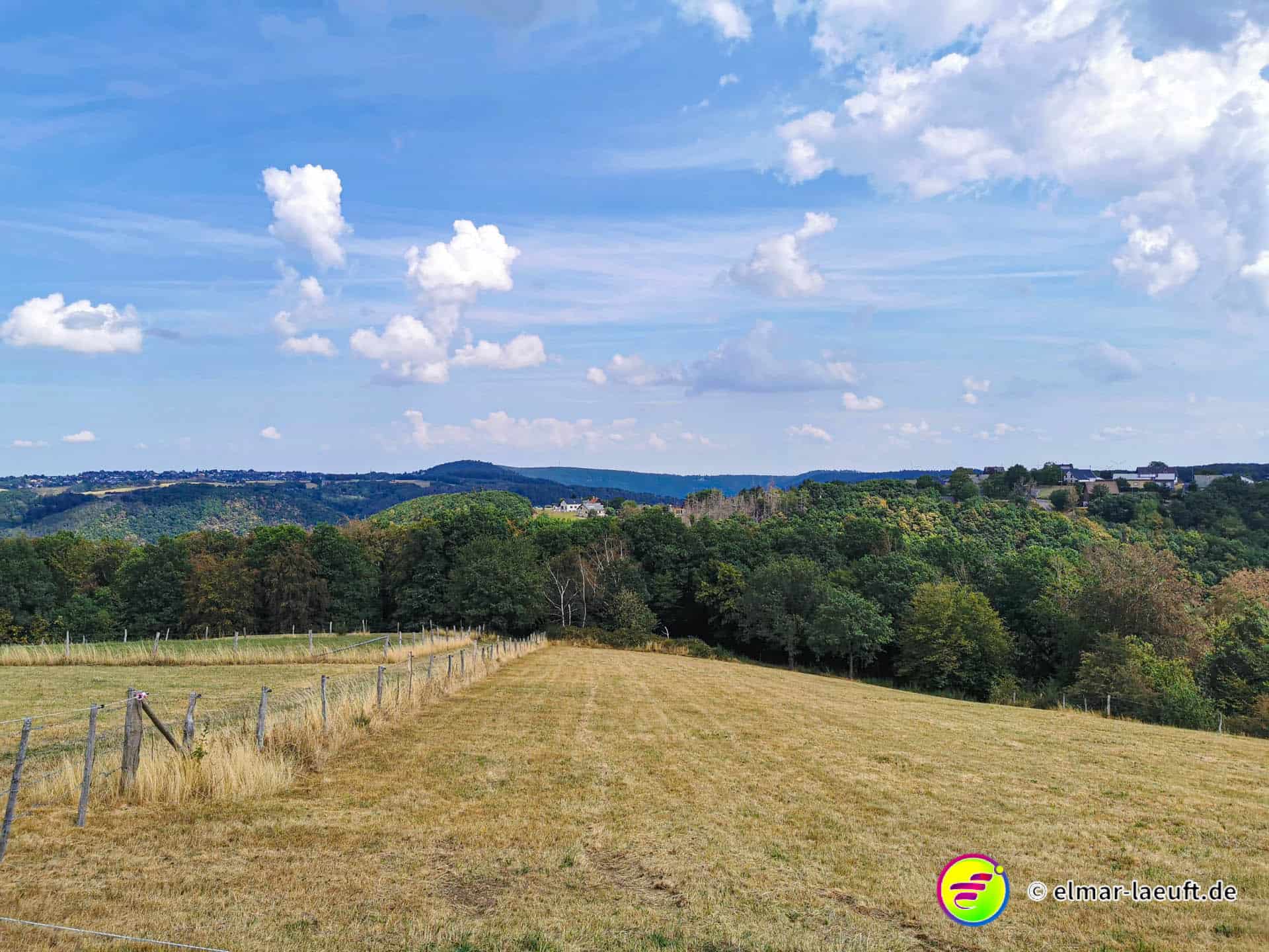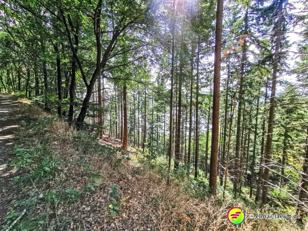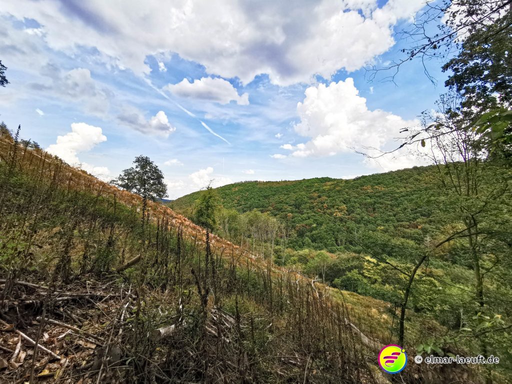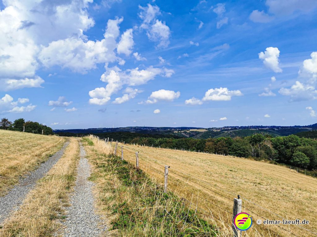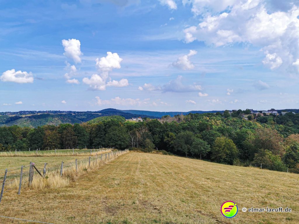 Ungefähr so lässt sich meine Strecke beschreiben und so komme ich dann am Ende auch auf über 700 Höhenmeter bei meiner Tour. Neben dem tollen Ausblick gibt es bei diesem warmen Wetter auf Wiesen – und besonders im Wald – eine andere Erschwernis. Bremsen! Kleine, gemeine Viecher, die es alle auf mich abgesehen haben.
